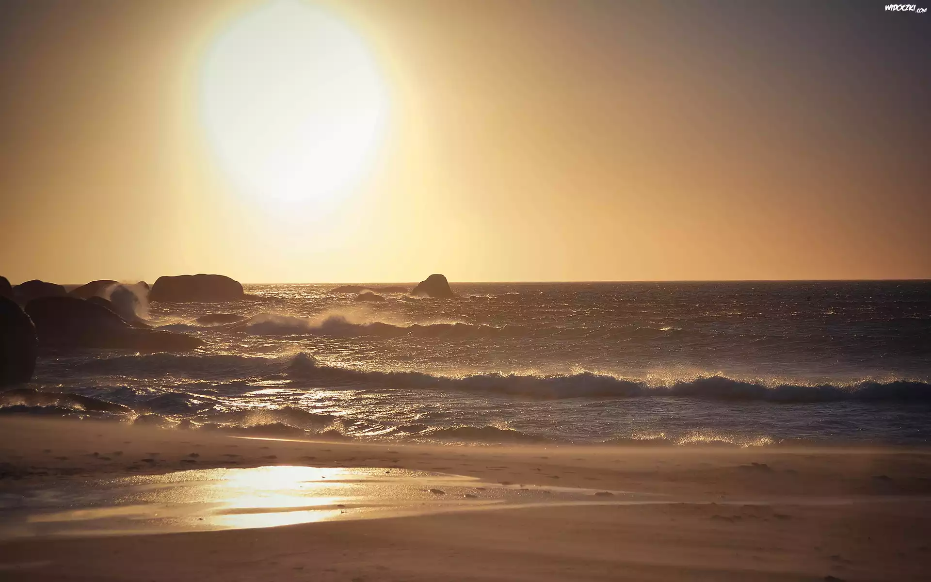 Zdjęcia, Plaża, Morze, Fale, Zachód Słońca