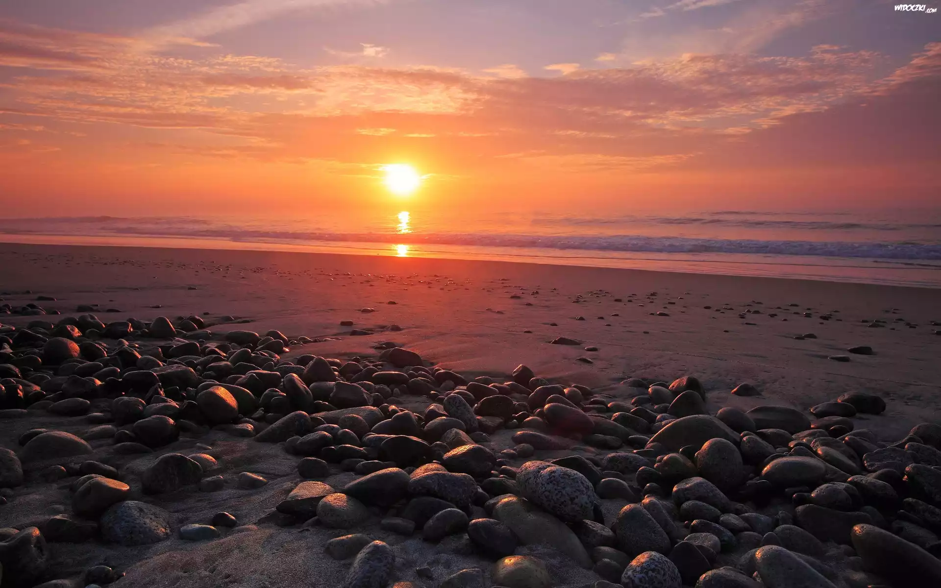 Plaża, Morze, Kamienie, Zachód, Słońca