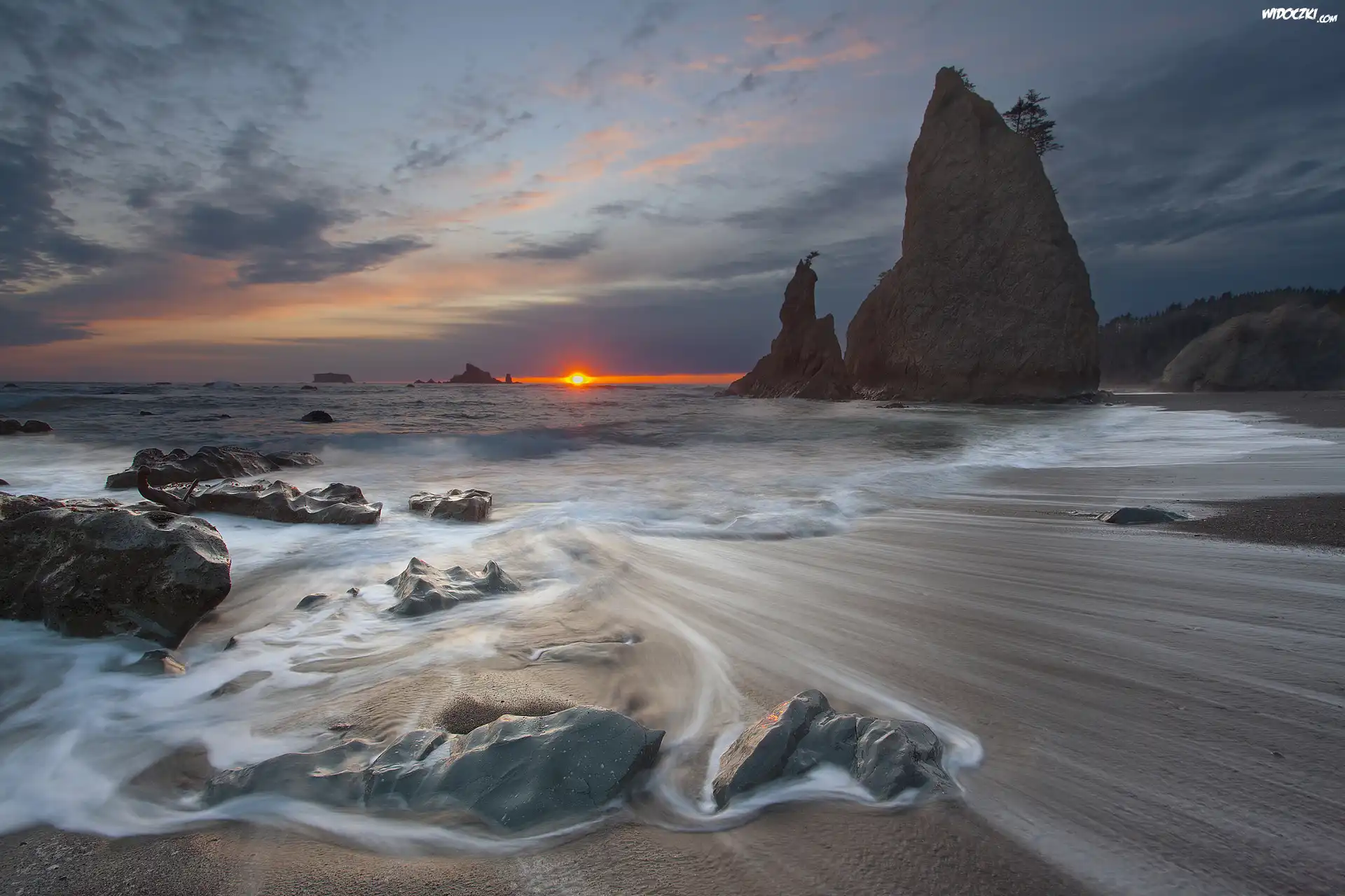 Zdjęcia, Plaża, Fale, Kamienie, Skały, Zachód Słońca