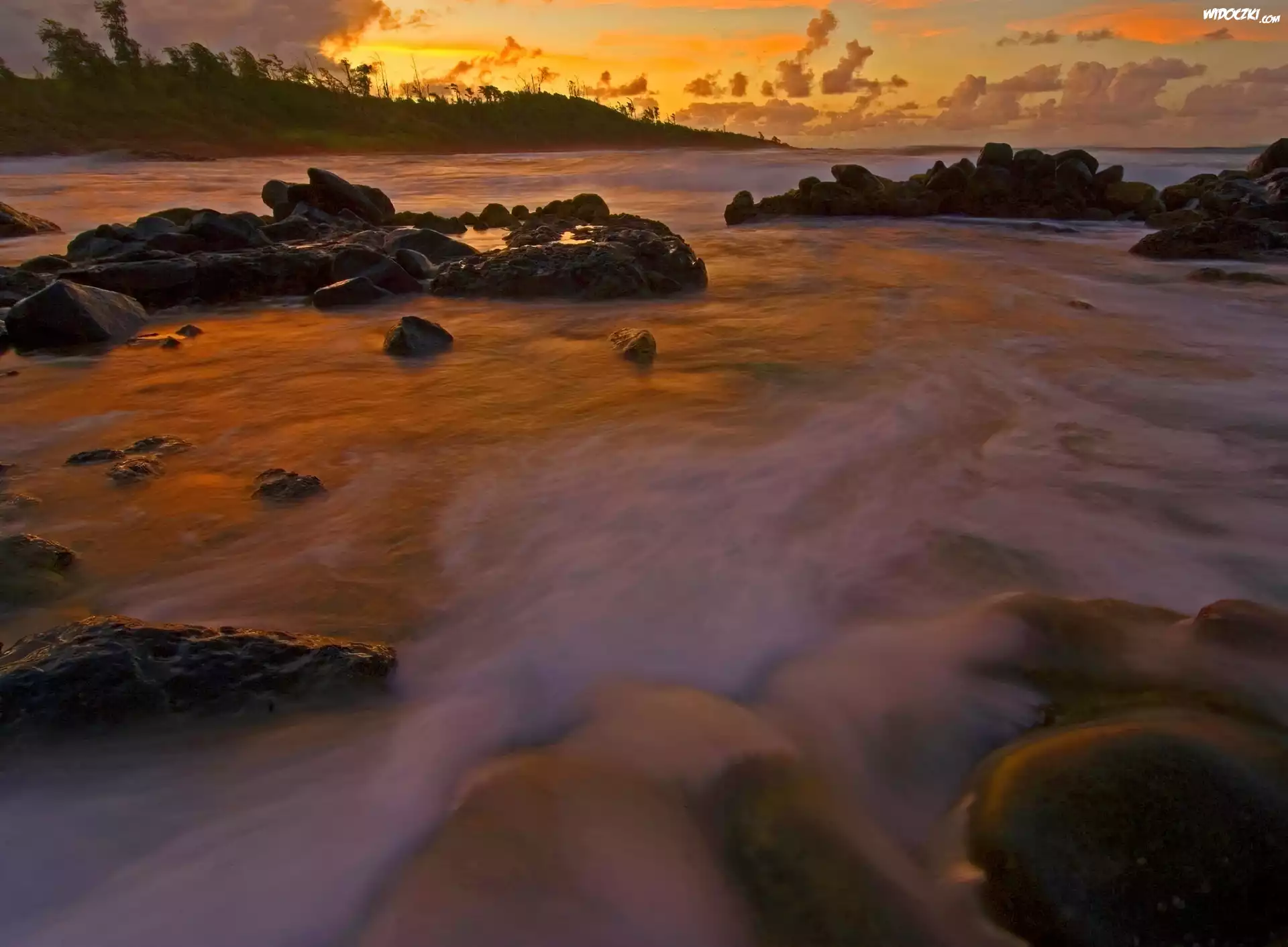 Zdjęcia, Plaża, Kamienie, Zachód Słońca