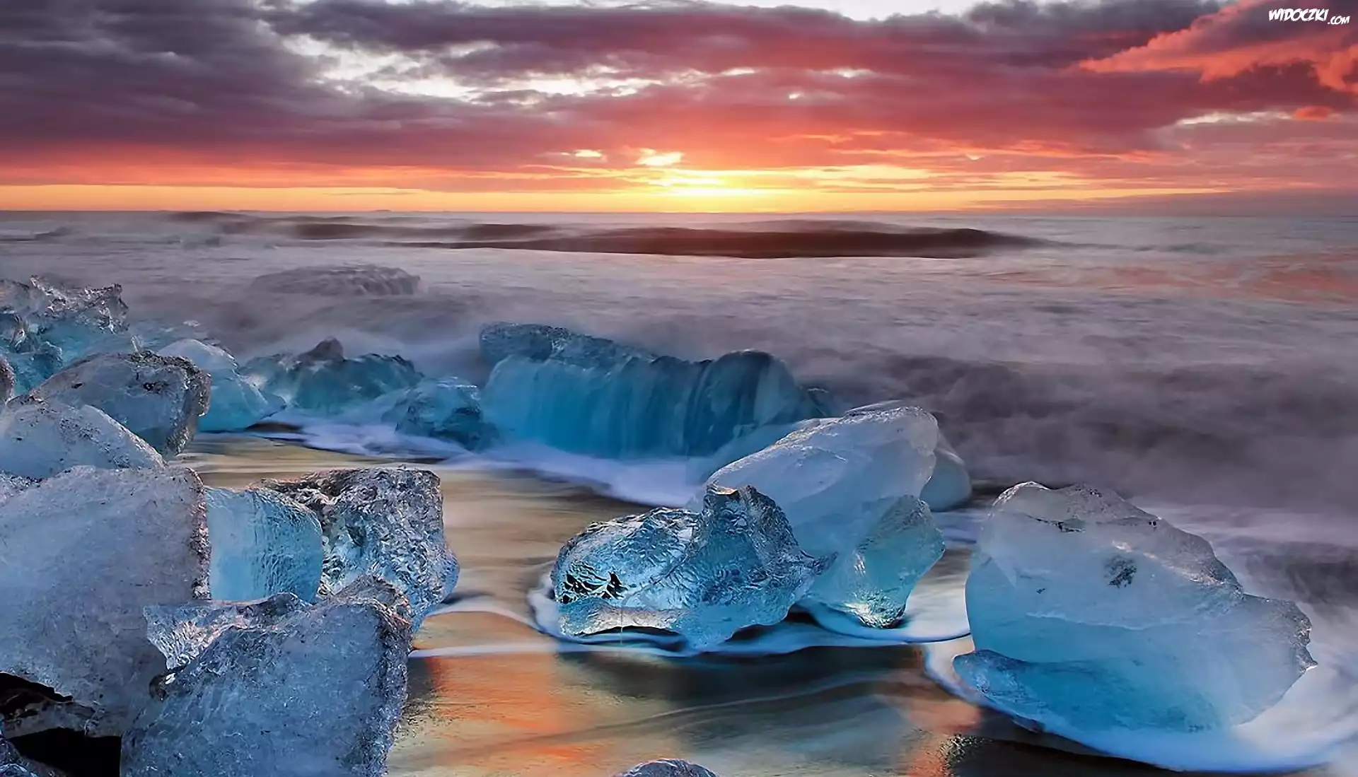 Zdjęcia, Plaża, Bryły, Lodu, Zachód, Słońća