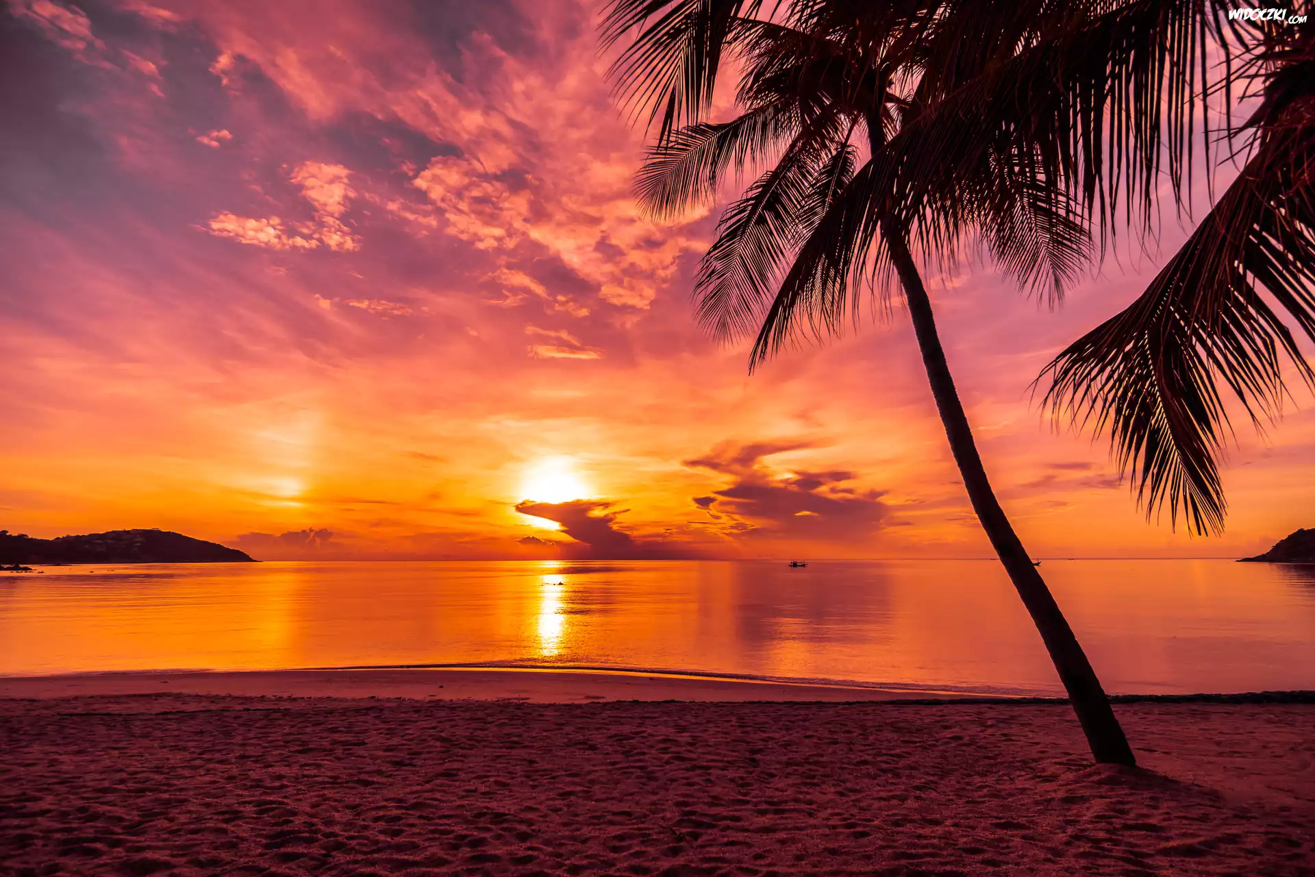 Zdjęcia, Palmy, Plaża, Zachód słońca, Morze