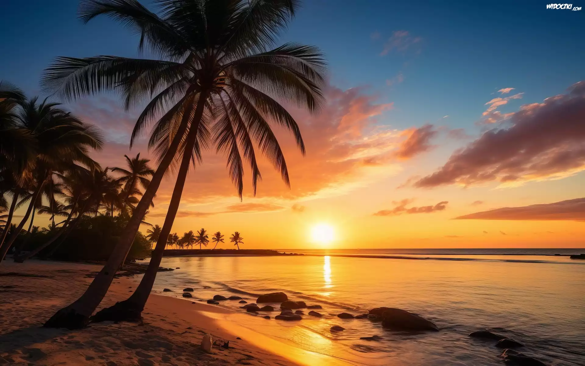 Zdjęcia, Morze, Plaża, Zachód słońca, Palmy