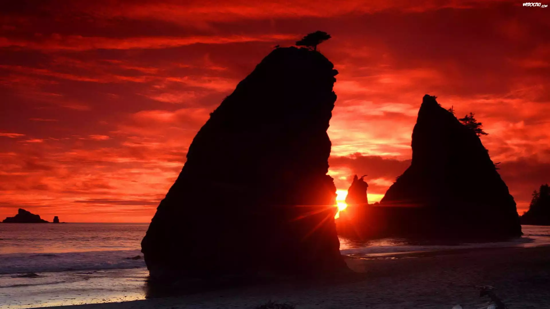 Zdjęcia, Plaża, Skała, Zachód Słońca