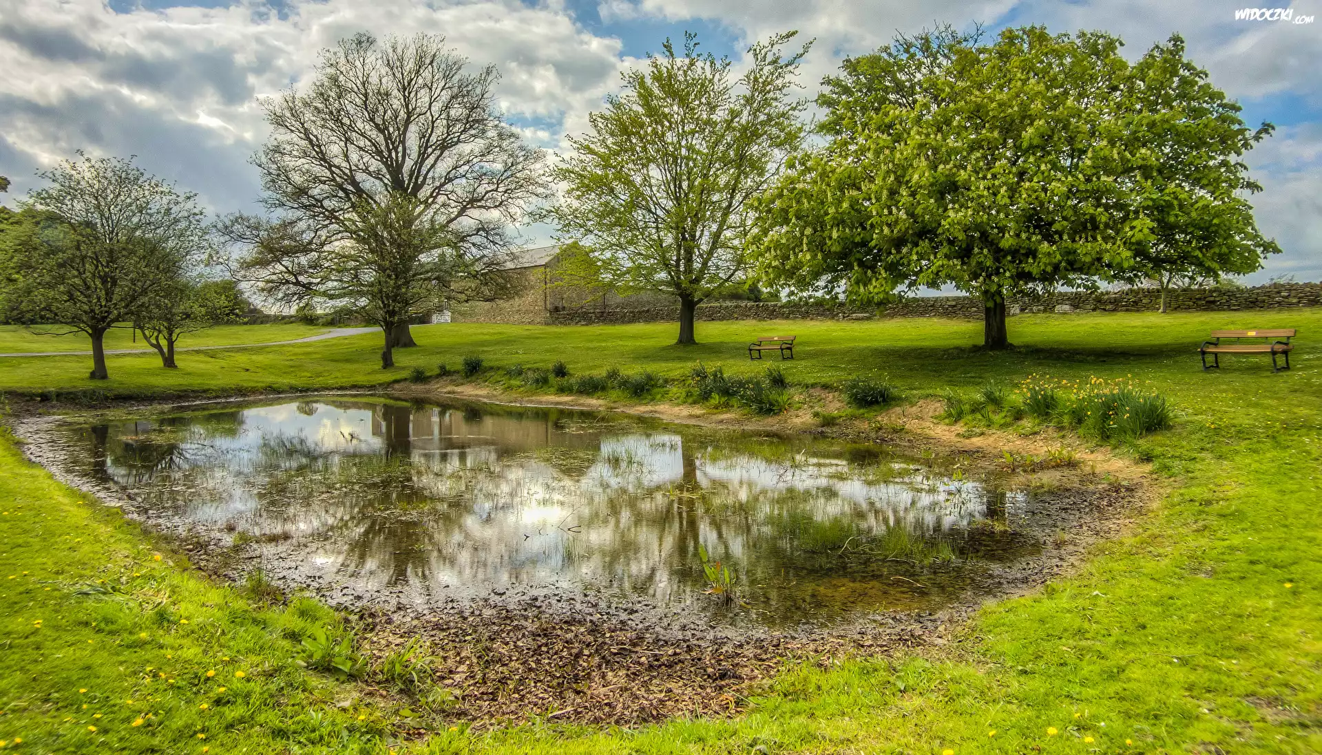 Zdjęcia, Anglia, Bishop Auckland, Bajorko, Drzewa, Ławki, Trawnik, Budynek, Płot