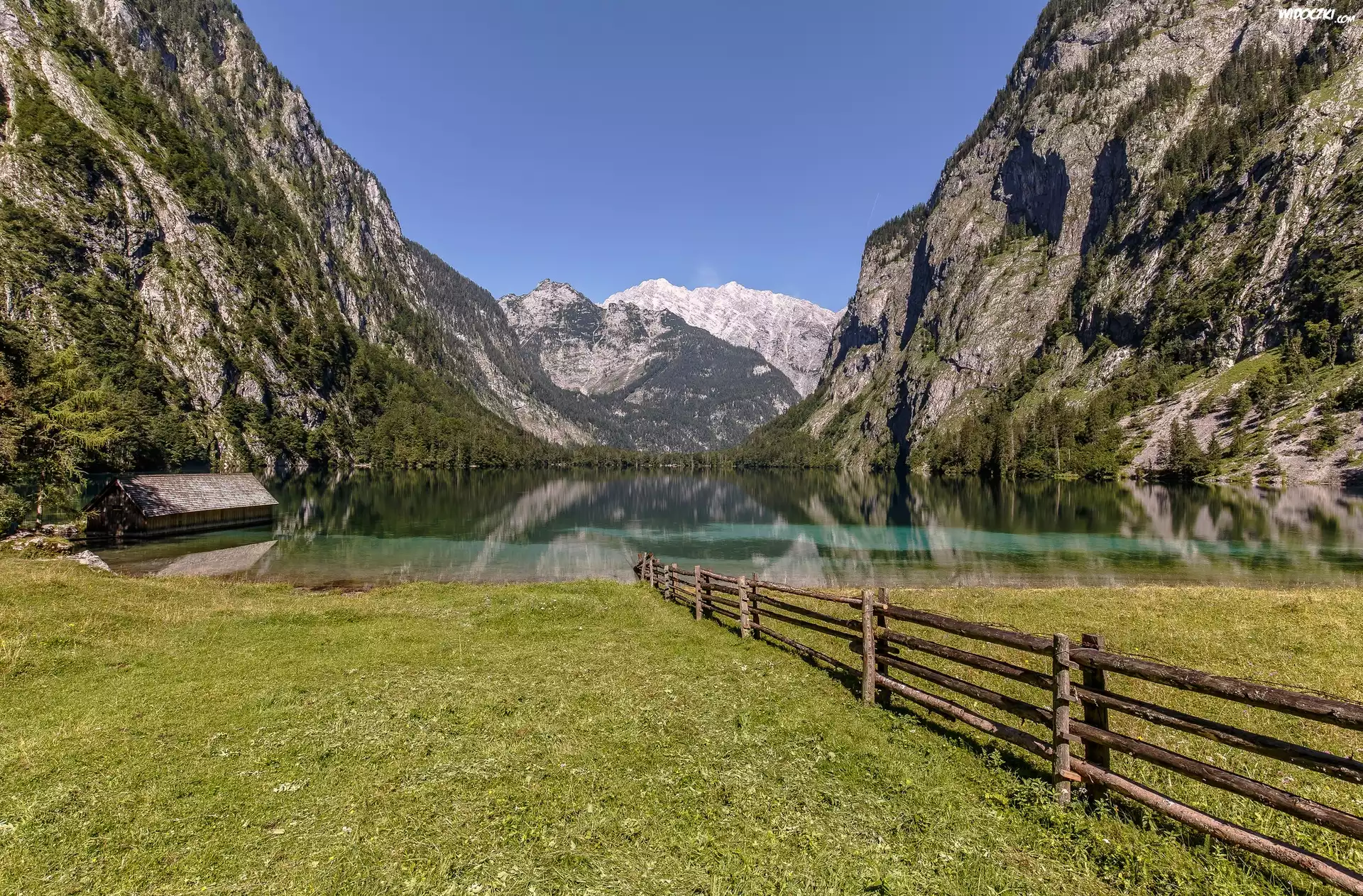 Zdjęcia, Niemcy, Bawaria, Park Narodowy Berchtesgaden, Jezioro Königssee, Alpy Bawarskie, Łąka, Płot