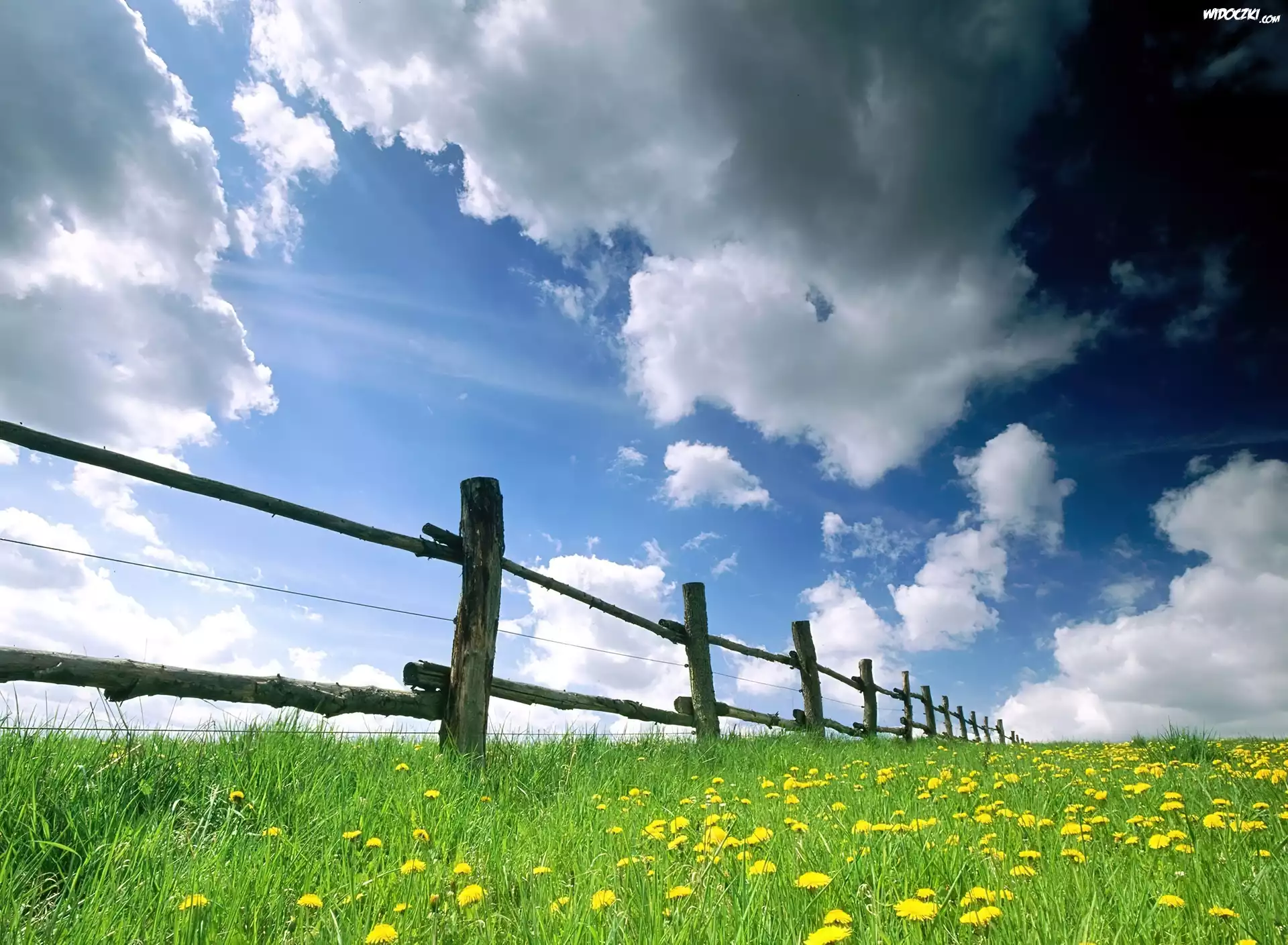 Zdjęcia, Łąka, Kwiatki, Płotek, Chmury
