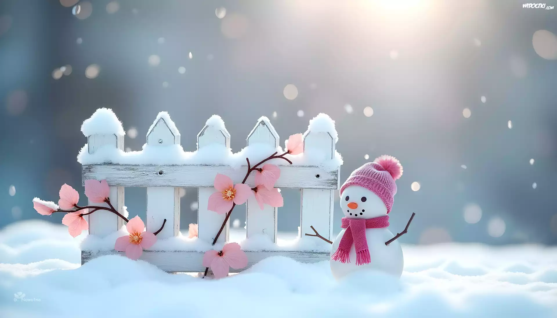 Zdjęcia, Bałwanek, Płotek, Różowe, Kwiaty, Grafika