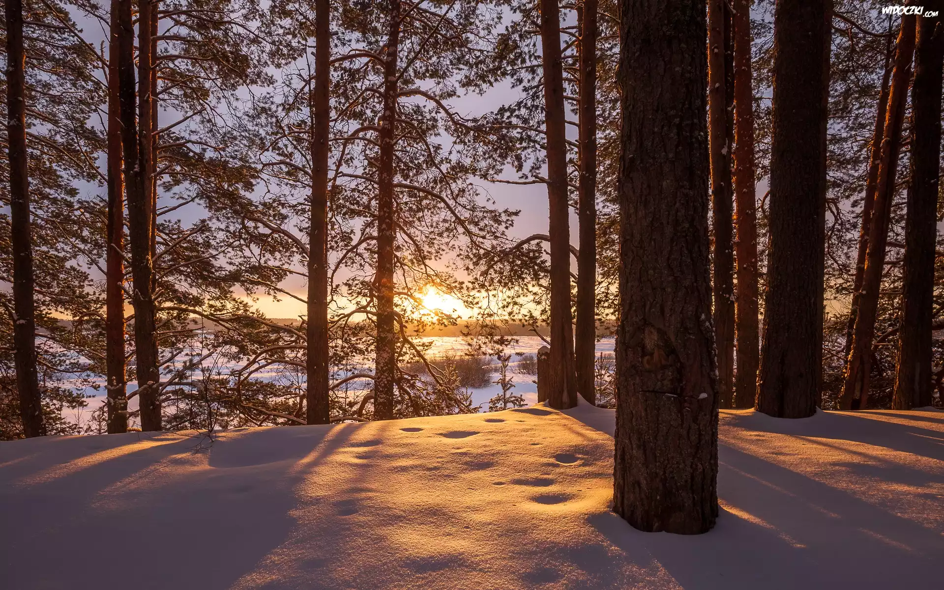 Zdjęcia, Zima, Pnie, Drzewa, Wschód słońca