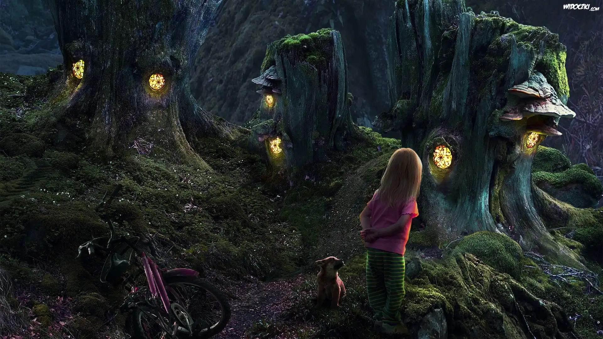 Zdjęcia, Pnie, Drzew, Światło, Góry, Dziewczynka, Piesek