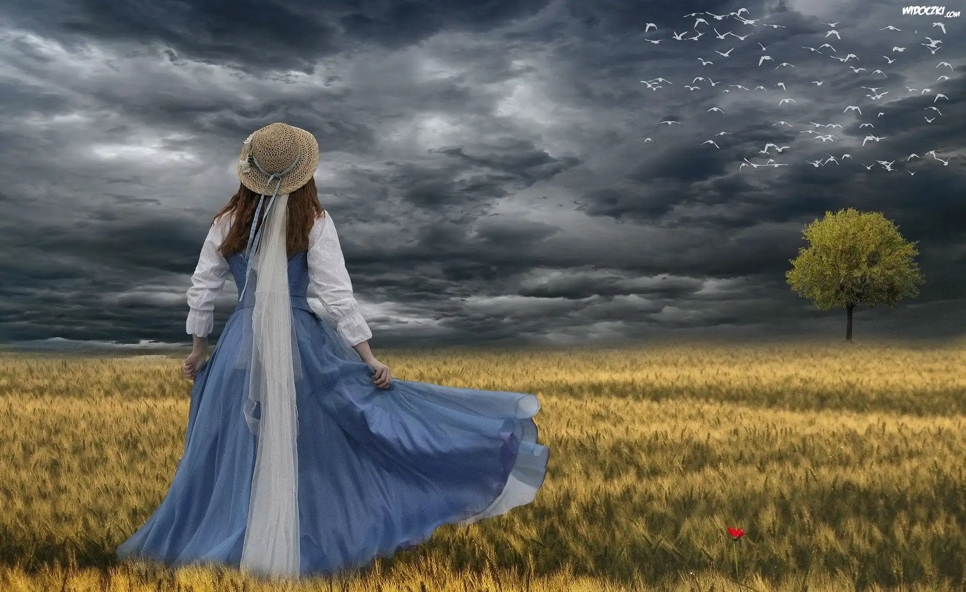 Pochmurne, Niebo, Zboża, Kobieta, Ptaki