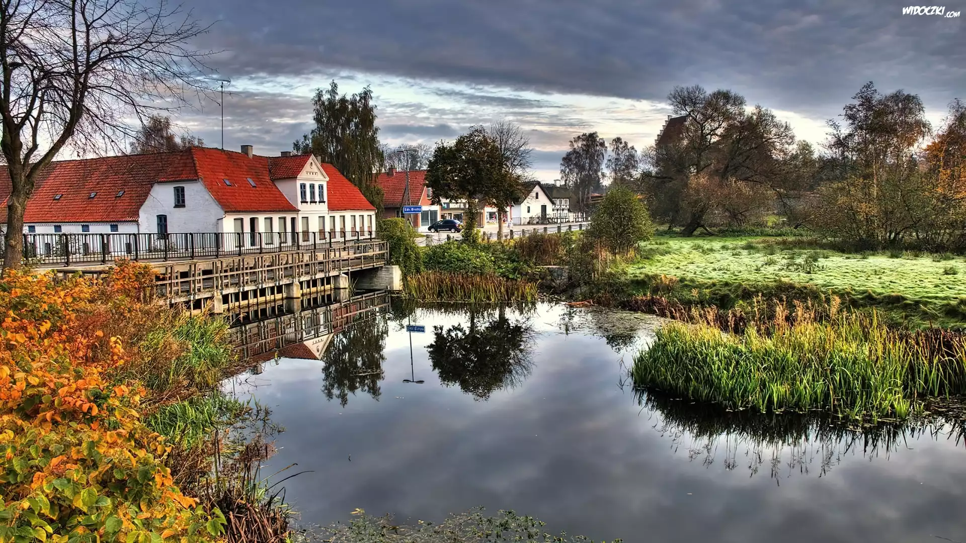 Zdjęcia, Pochmurne, Niebo, Domy, Most, Odbicie
