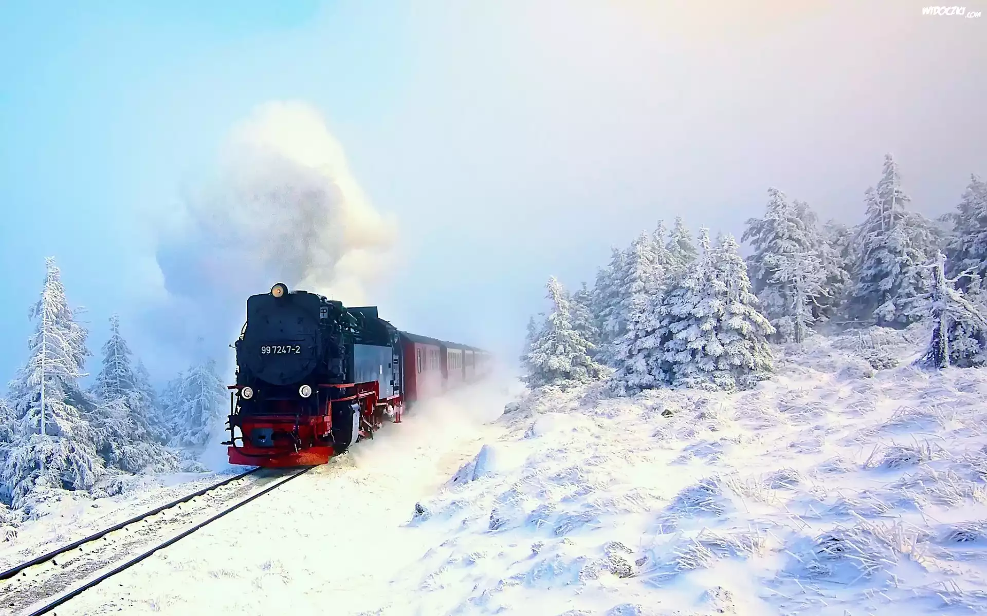 Zdjęcia, Pociąg, Lasy, Drzewa, Zima
