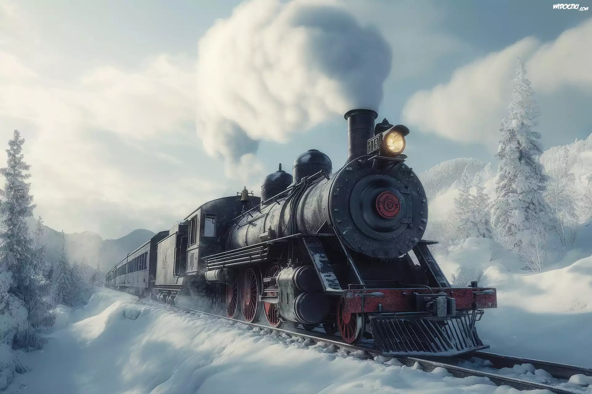 Zima, Pociąg, Parowy, Tory, Drzewa