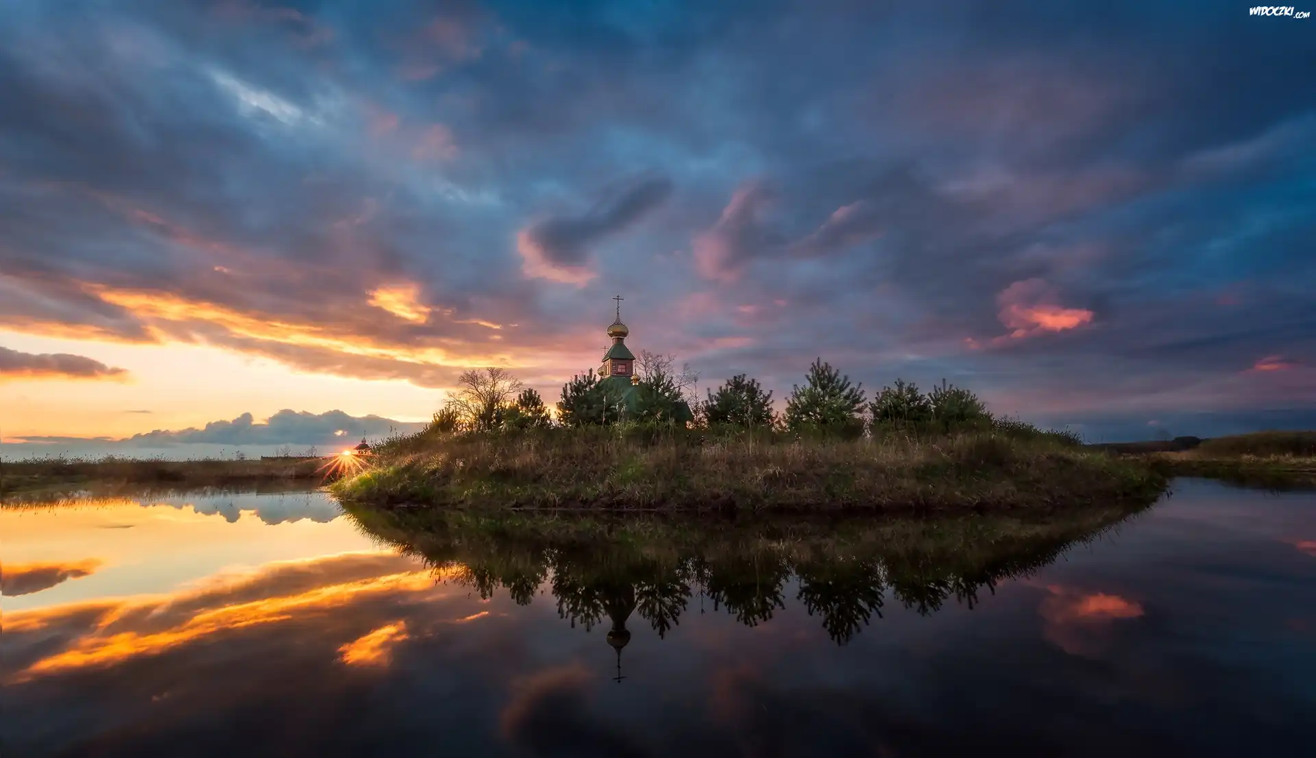 Rzeka Narew, Kościół, Pustelnia, Skit Świętych Antoniego i Teodozjusza Pieczerskich, Drzewa, Chmury, Zachód słońca, Chmury, Uroczysko Kudak, Wieś Ordynki, Podlaskie, Polska |