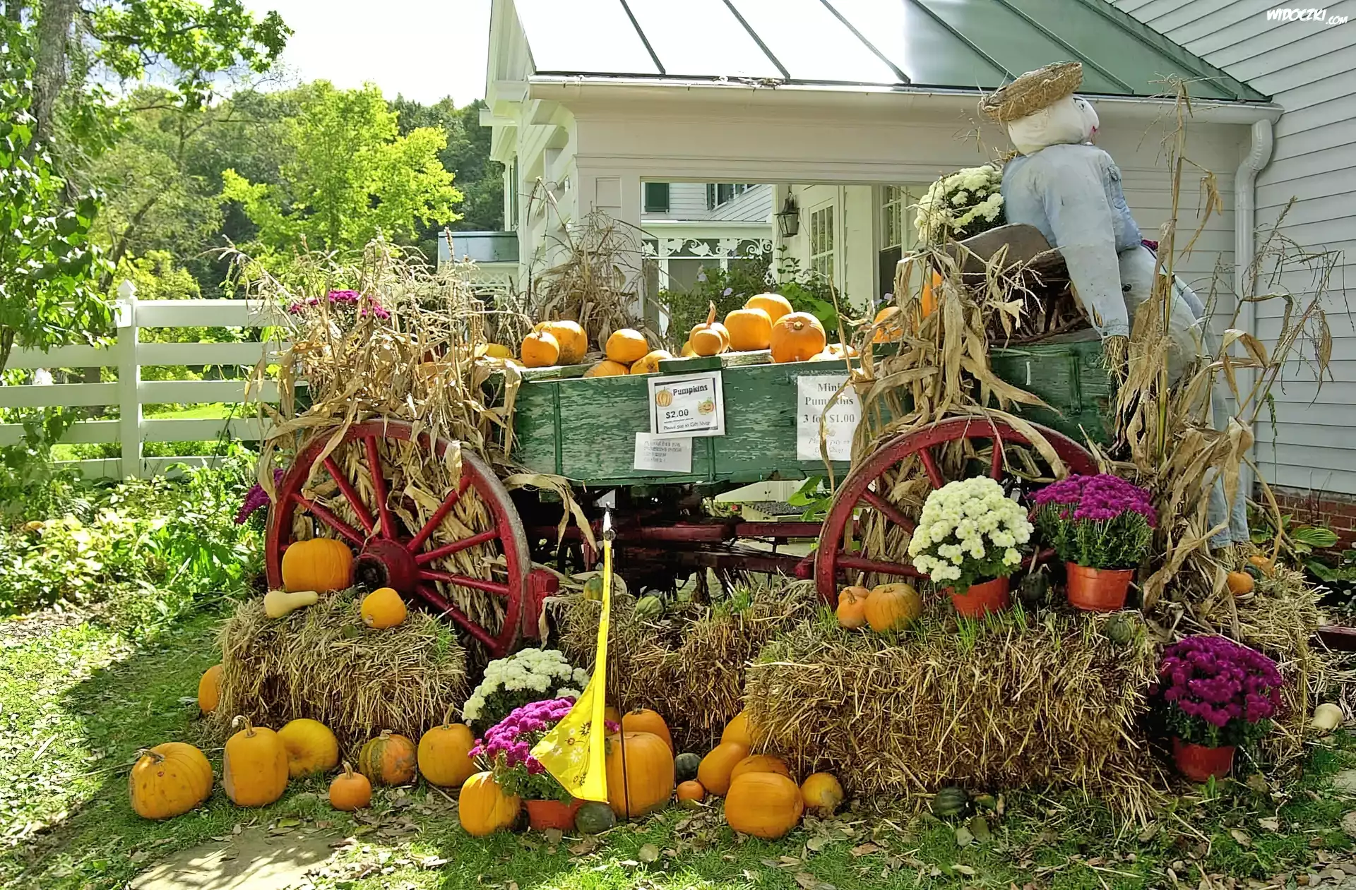 Zdjęcia, Podwórze, Wóz, Dynie, Kwiaty