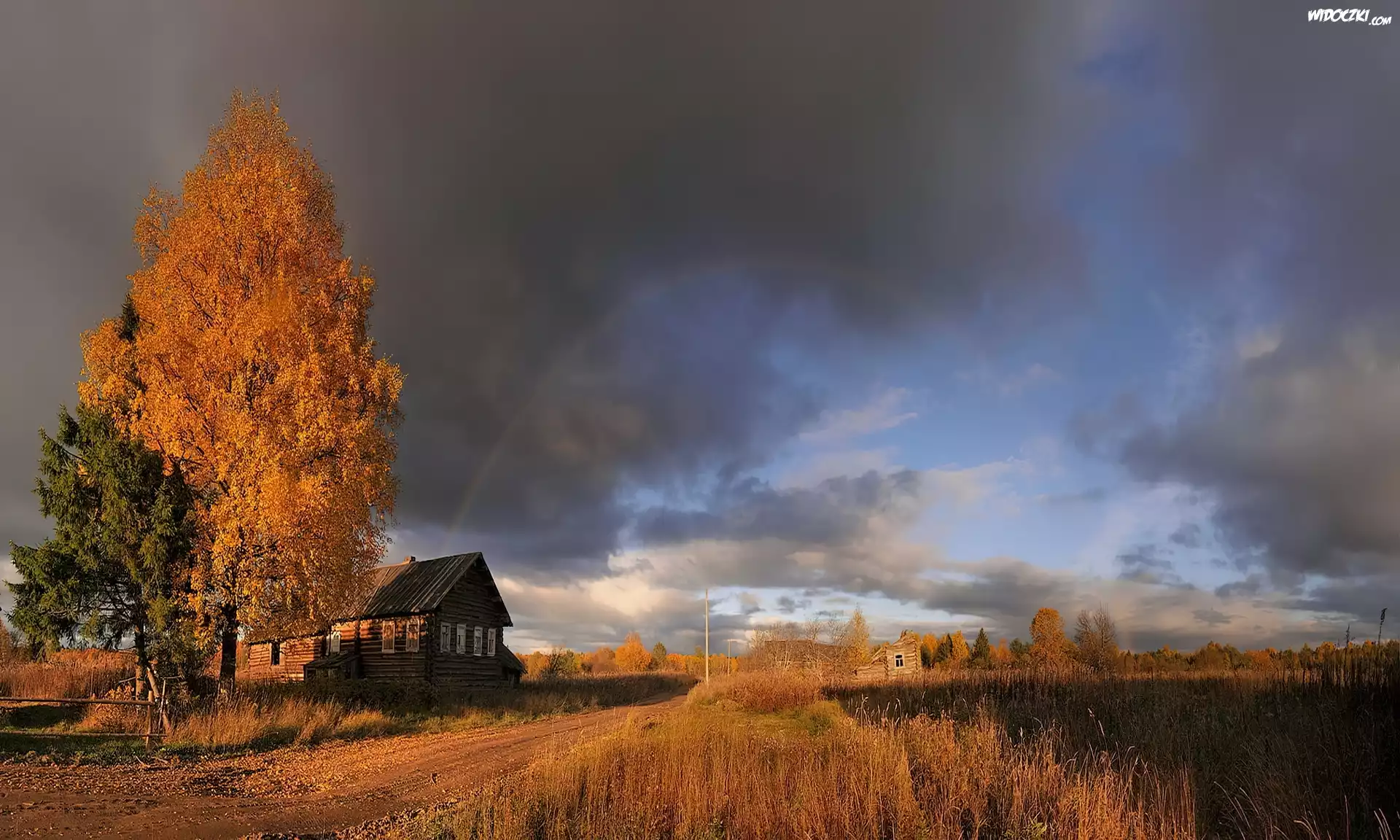 Zdjęcia, Pola, Droga, Drzewa, Dom, Chmury, Tęcza