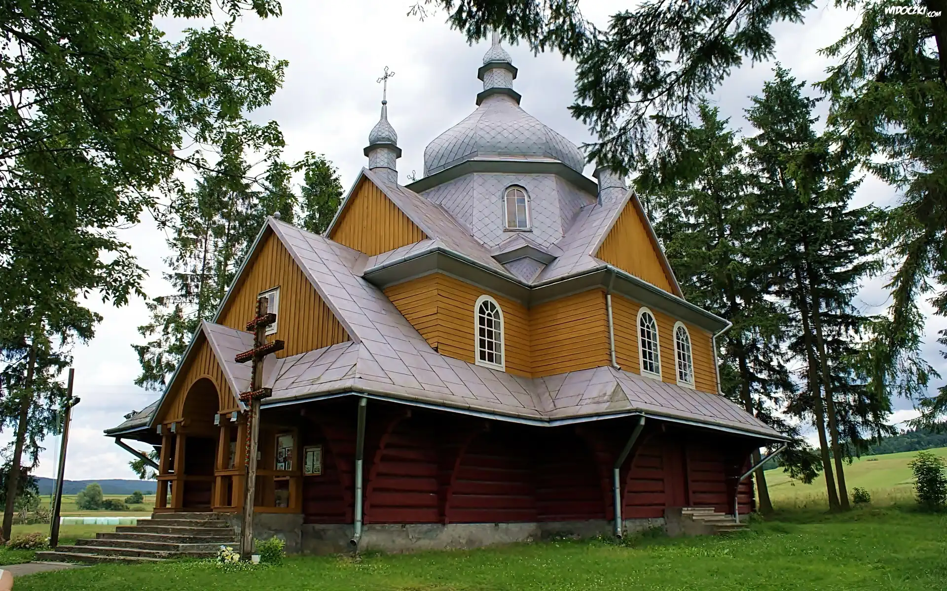 Zdjęcia, Pola, Drzewa, Drewniany, Kościółek