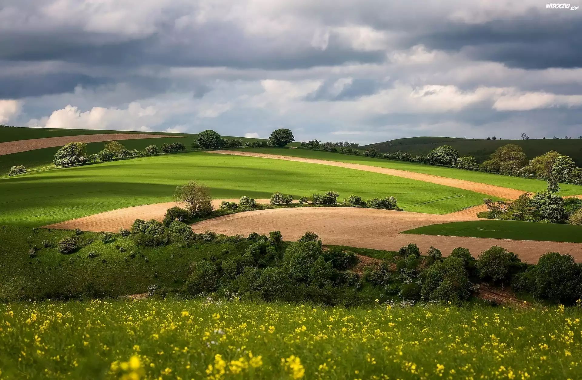 Zdjęcia, Pola uprawne, Łąka, Drzewa, Chmury