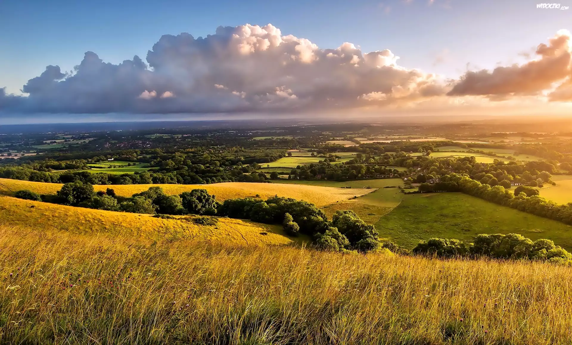 Zdjęcia, Pola, Łąki, Drzewa, Chmury