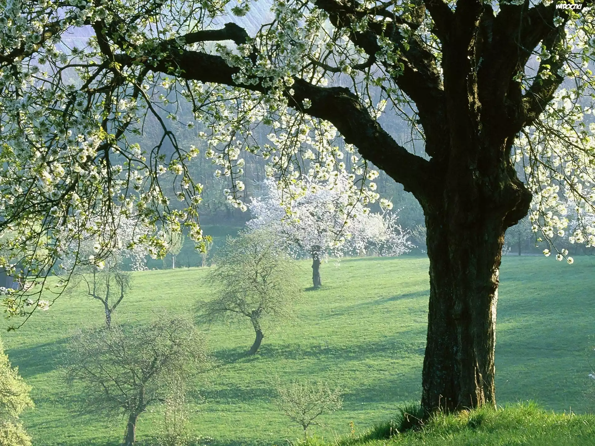 Zdjęcia, Pola, Kwitnące, Drzewa, Wiosna