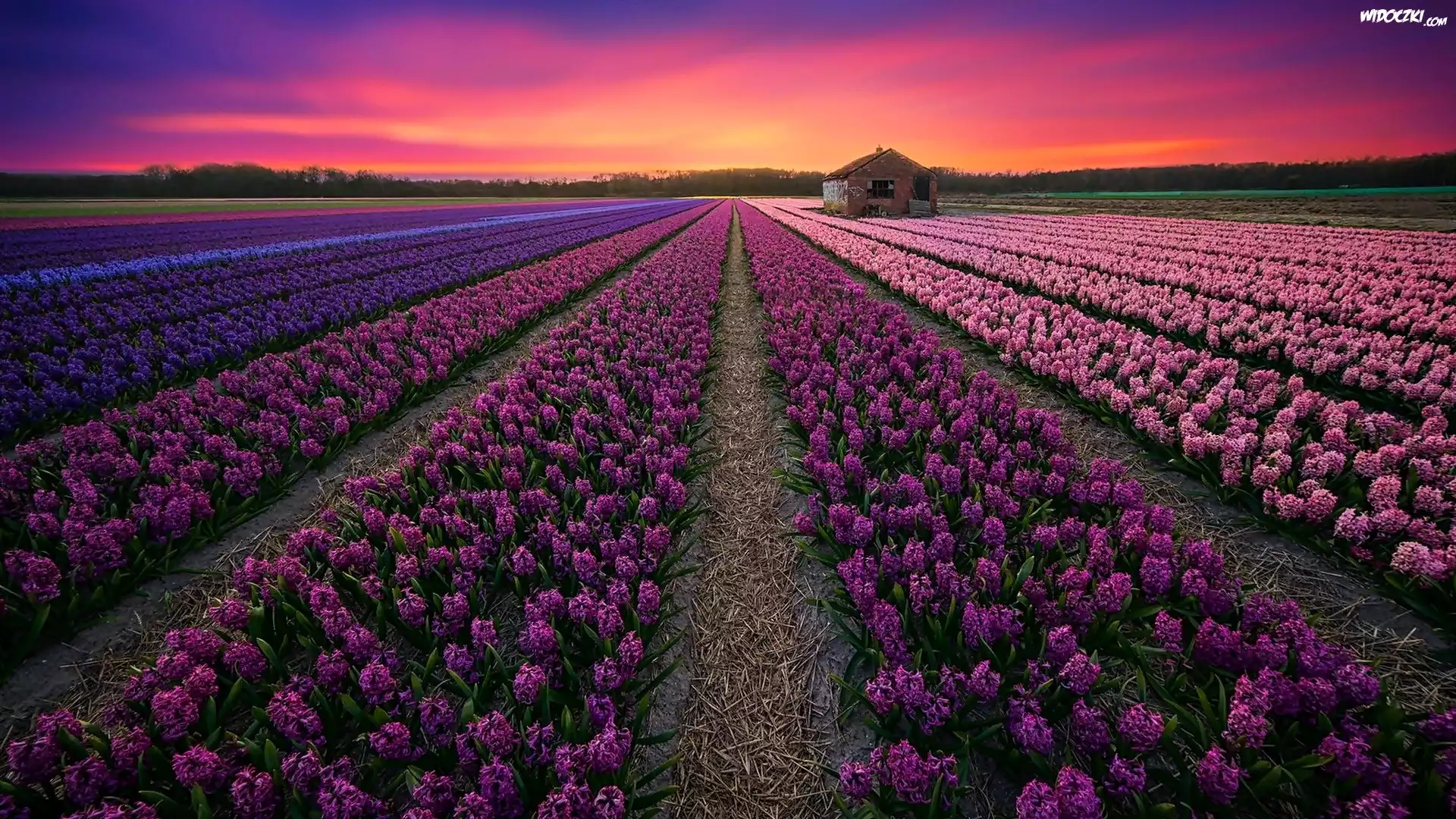 Zdjęcia, Holandia, Pola, Kwiaty, Hiacynty, Zachód Słońca, Domek