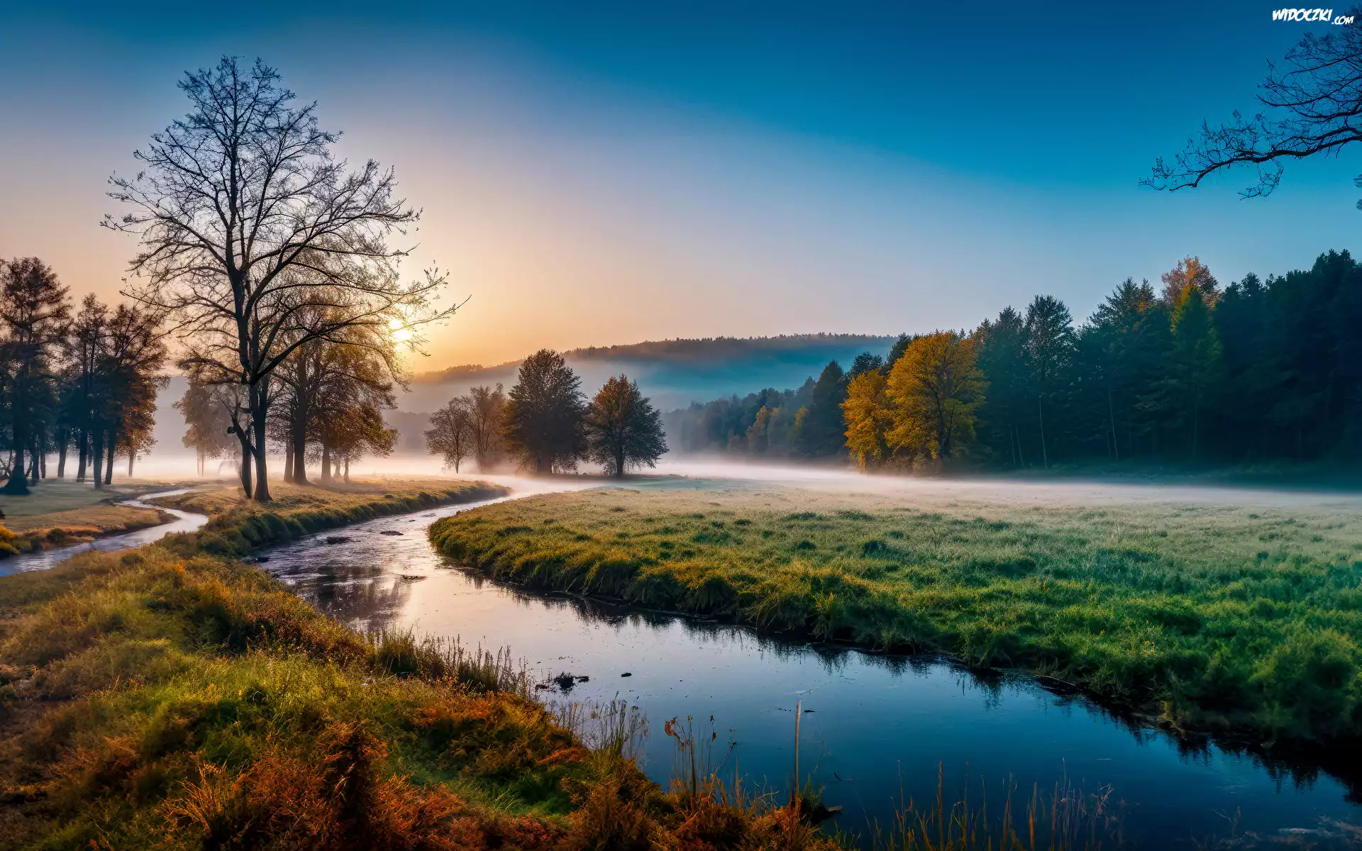 Góry, Las, Mgła, Pola, Rzeka, Poranek