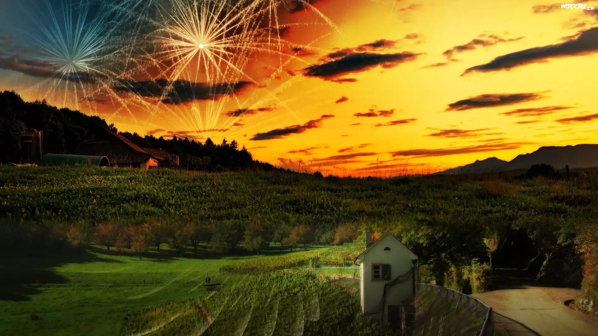 Zdjęcia, Pola, Lasy, Dom, Zachód, Słońca, Petardy