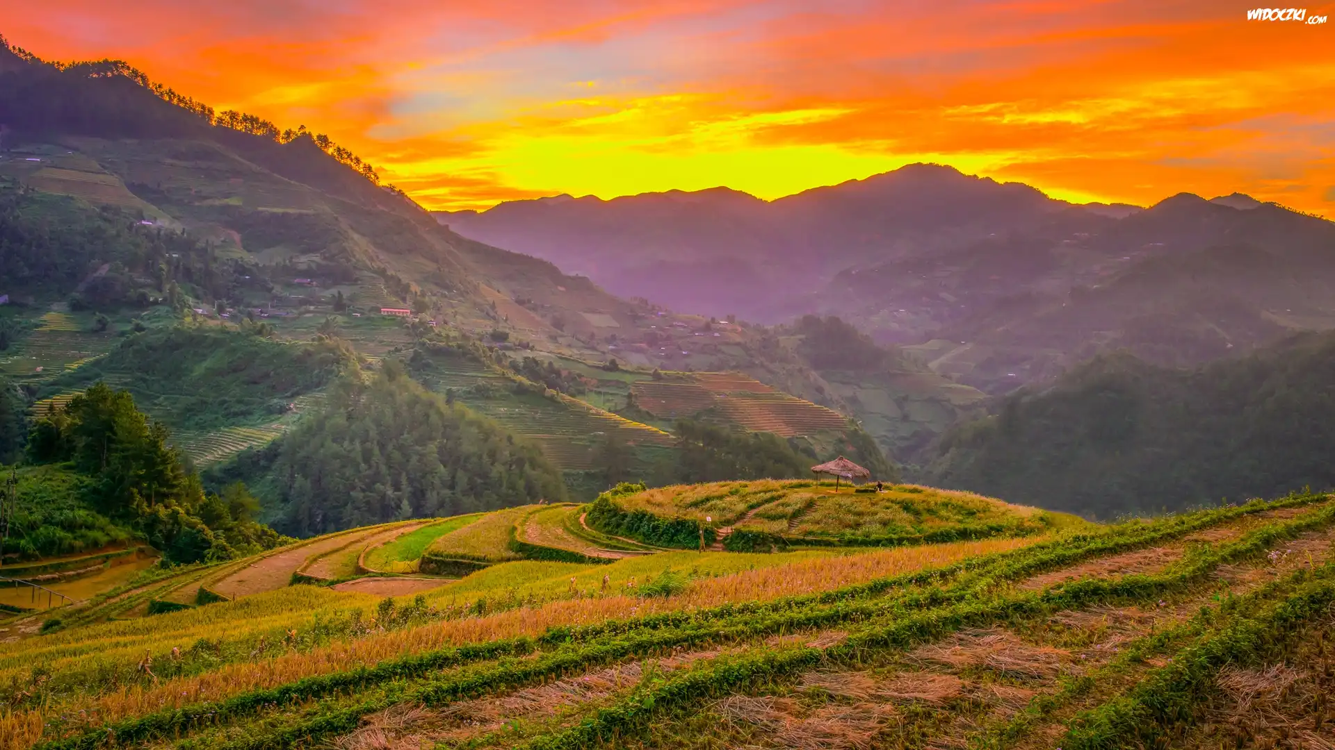 Zdjęcia, Góry, Pola, Tarasy ryżowe, Domy, Lasy, Zachód słońca