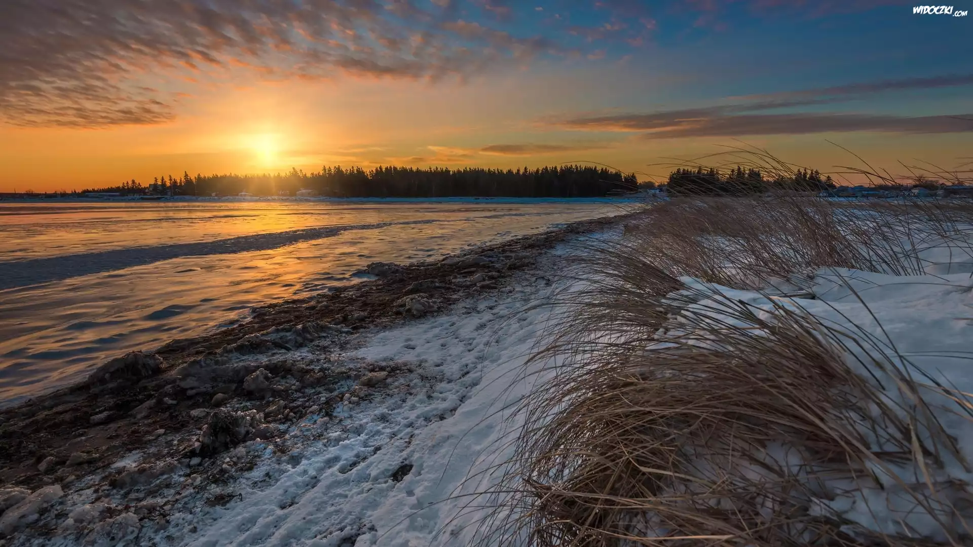 Pola, Śnieg, Zachód słońca, Suche, Trawy
