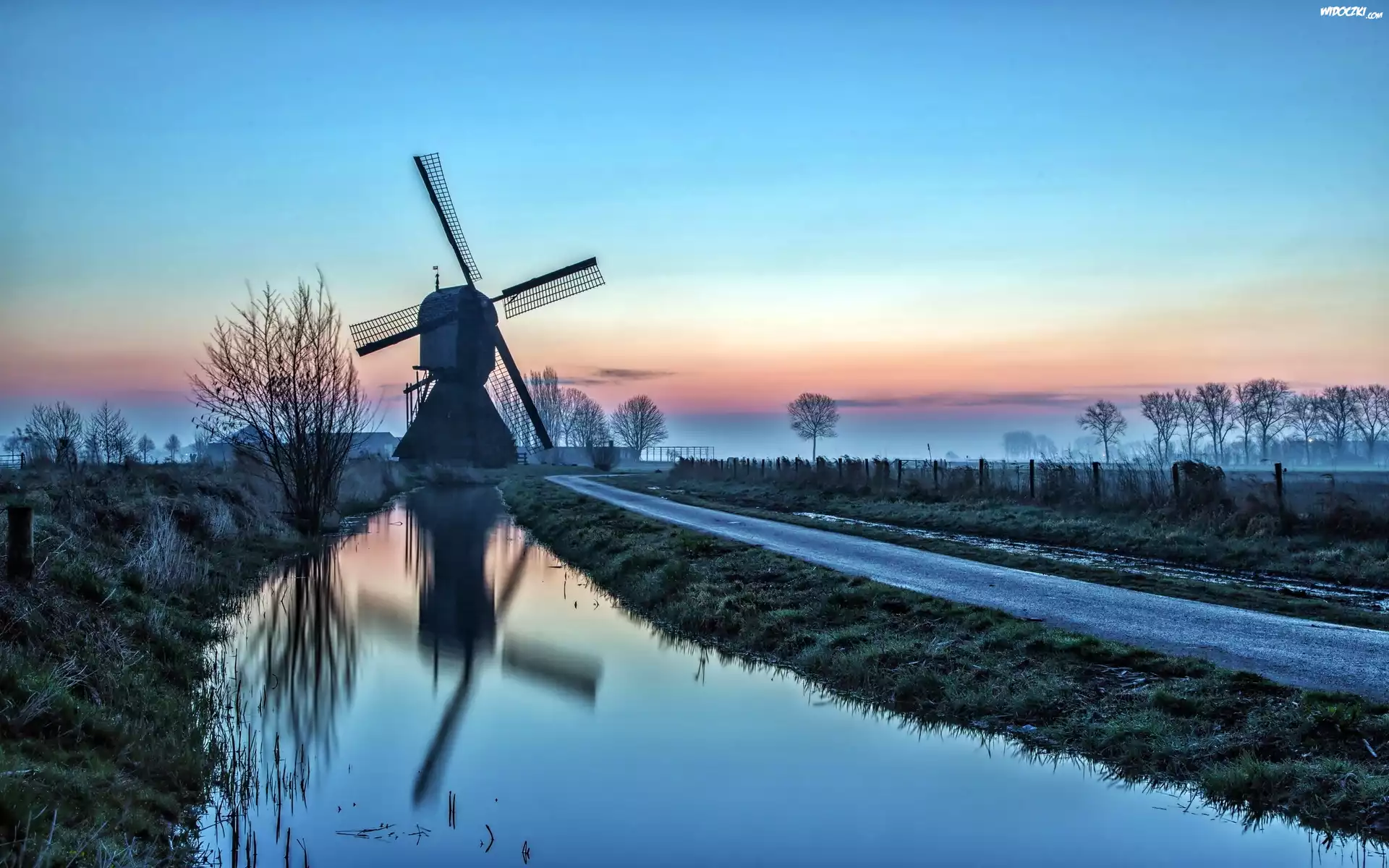 Pola, Rzeka, Mgła, Wiatrak, Świt
