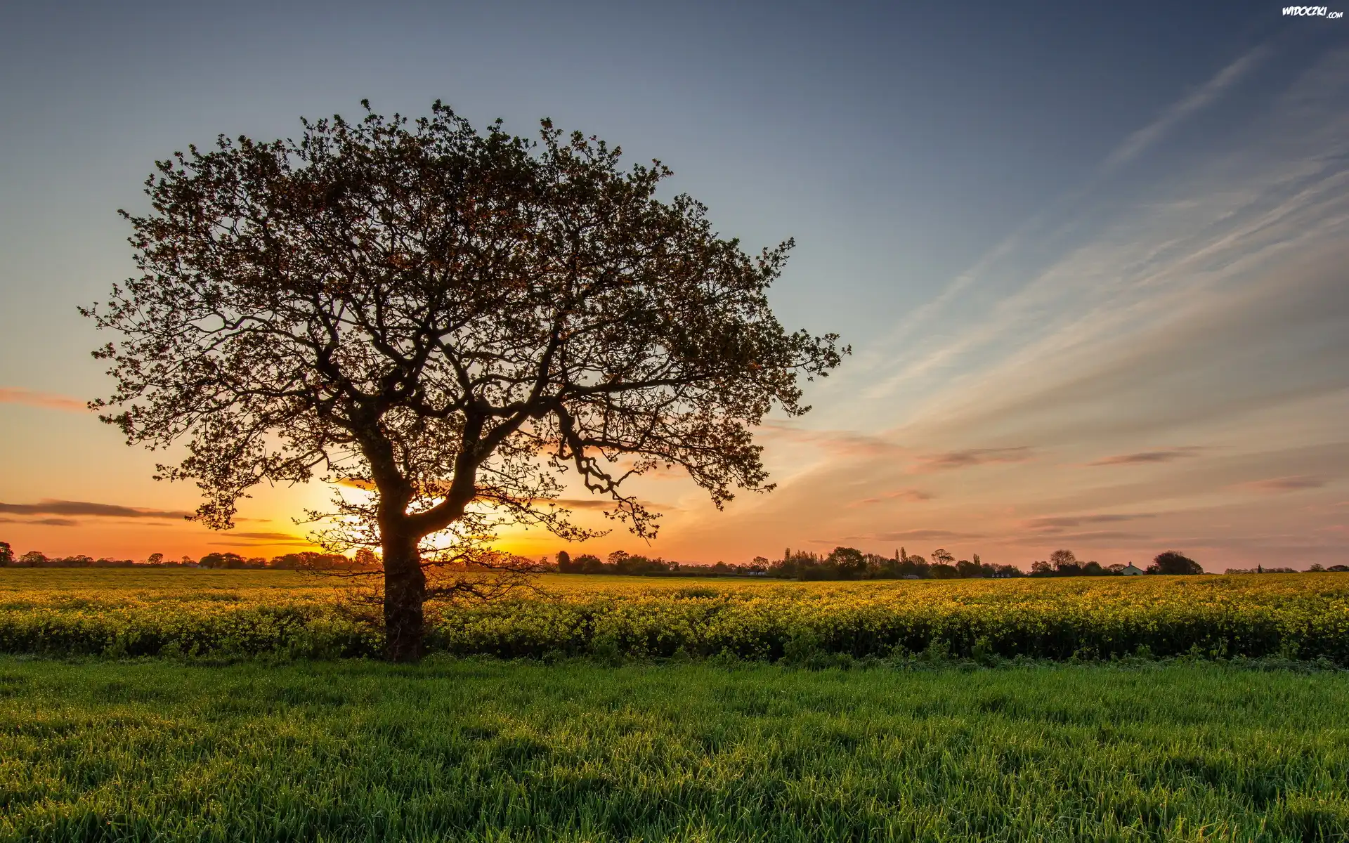 Zdjęcia, Pola, Łąki, Drzewo, Zachód, Słońca