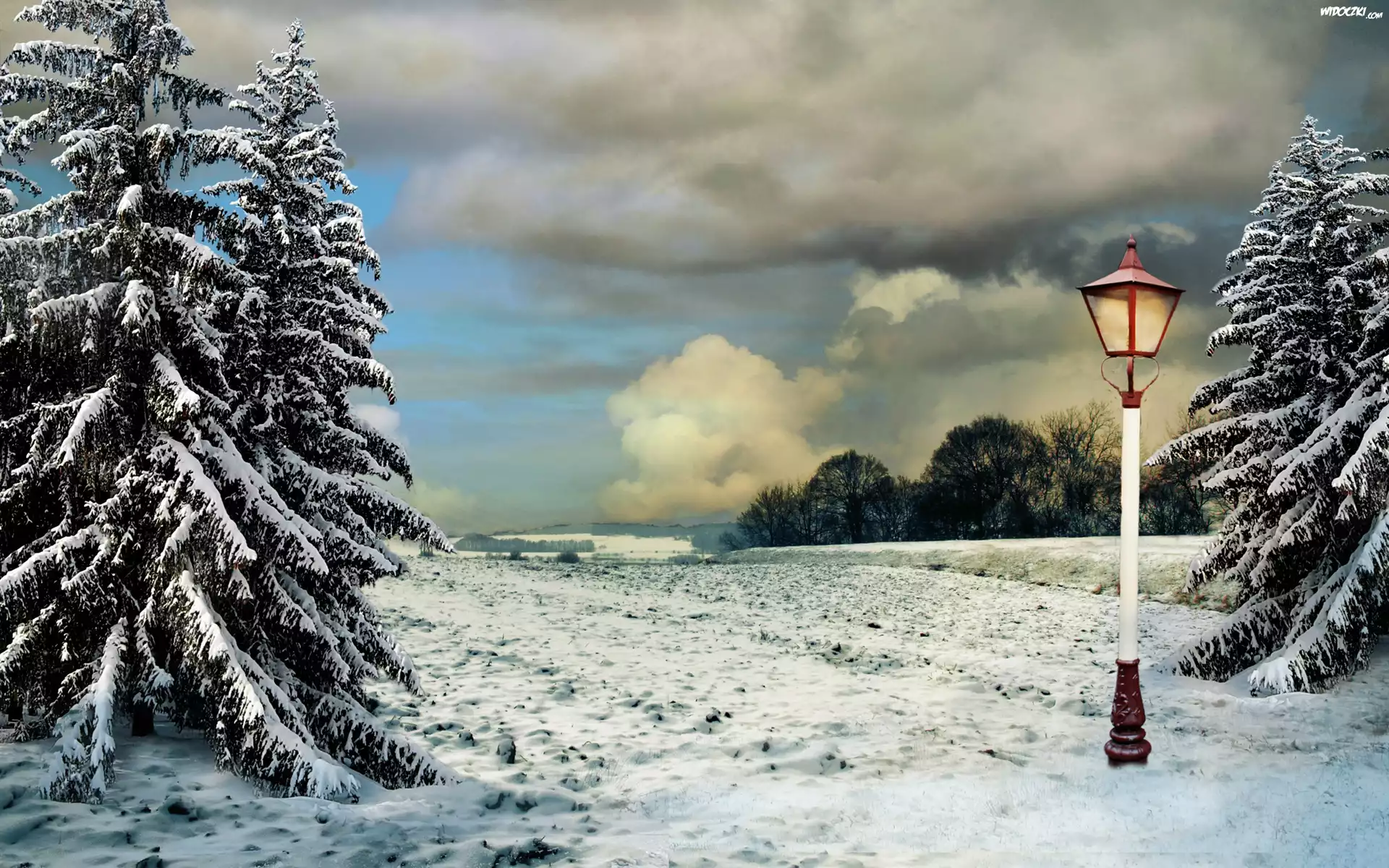 Zdjęcia, Pola, Lasy, Latarnia, Chmury, Zima, Świerki