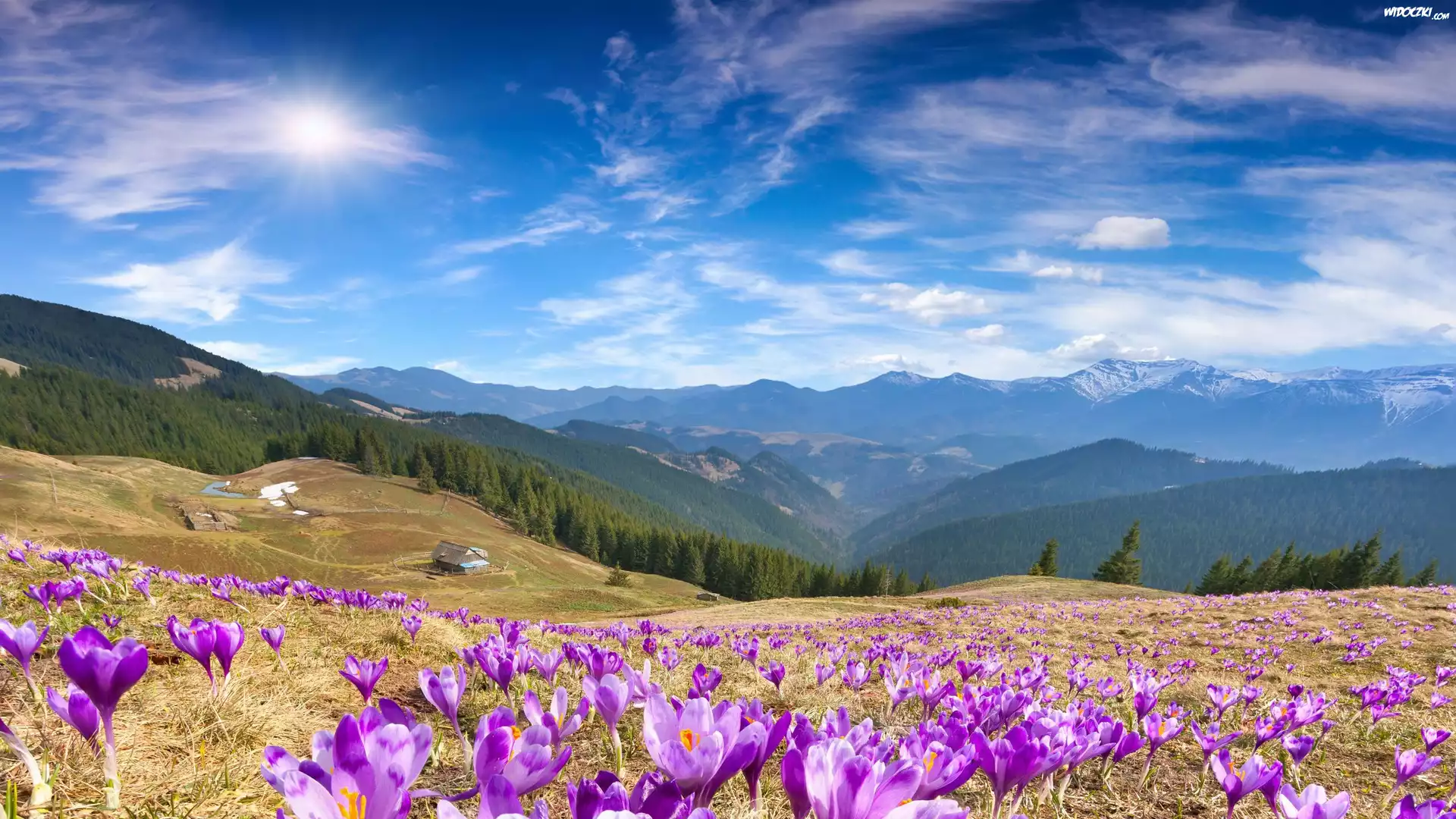 Góry, Polana, Łąka, Krokusy, Domy, Promienie słońca, Chmury