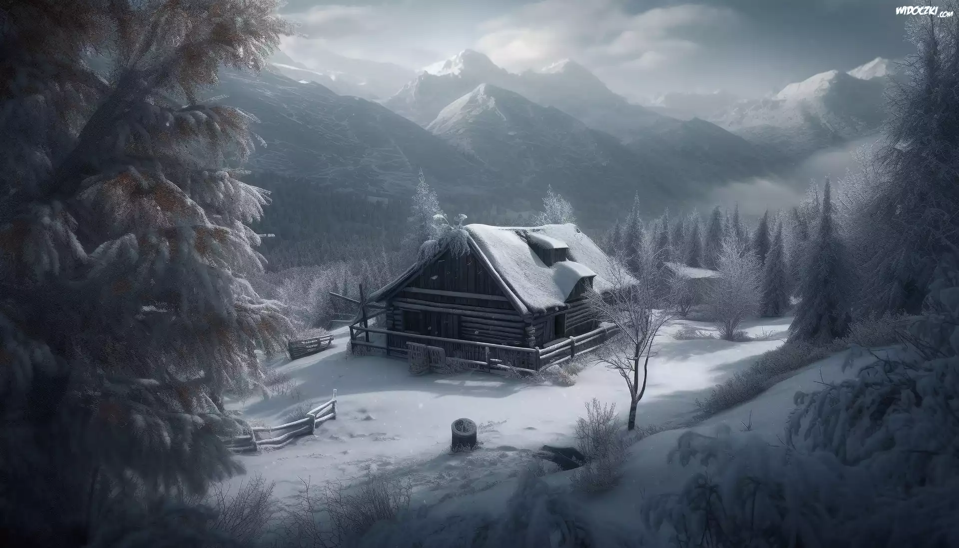 Zdjęcia, Zima, Dom, Drzewa, Polana, Góry, Grafika