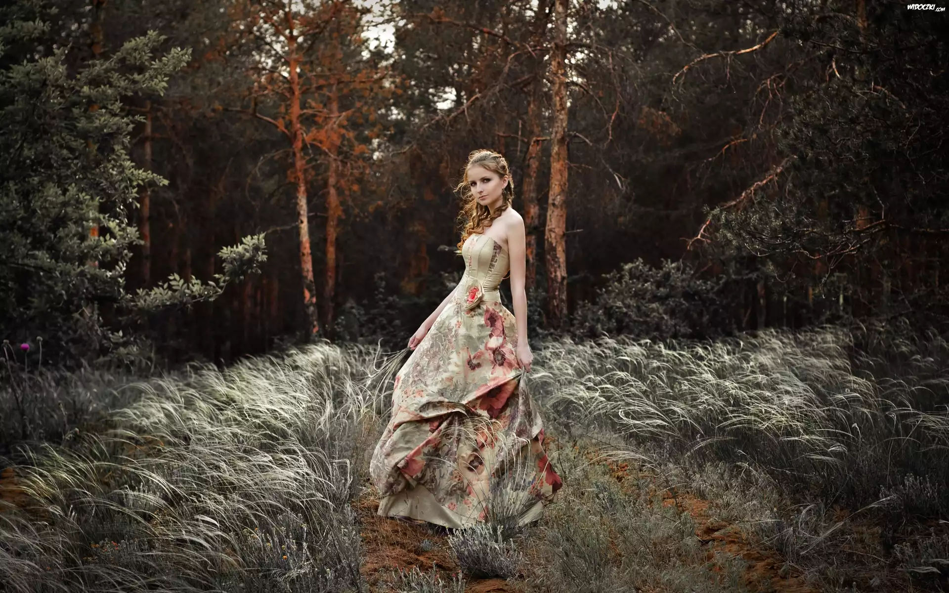 Zdjęcia, Las, Polana, Sucha, Trawa, Kobieta, Długa, Sukienka