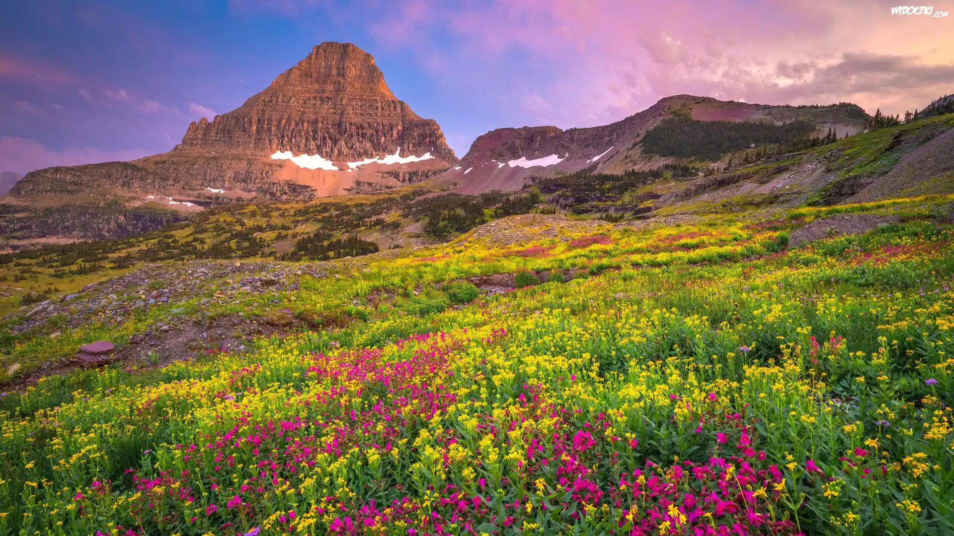 Park Narodowy Glacier, Polana, Kwiaty, Góra, Mount Reynolds, Łąka, Niebo, Montana, Stany Zjednoczone |