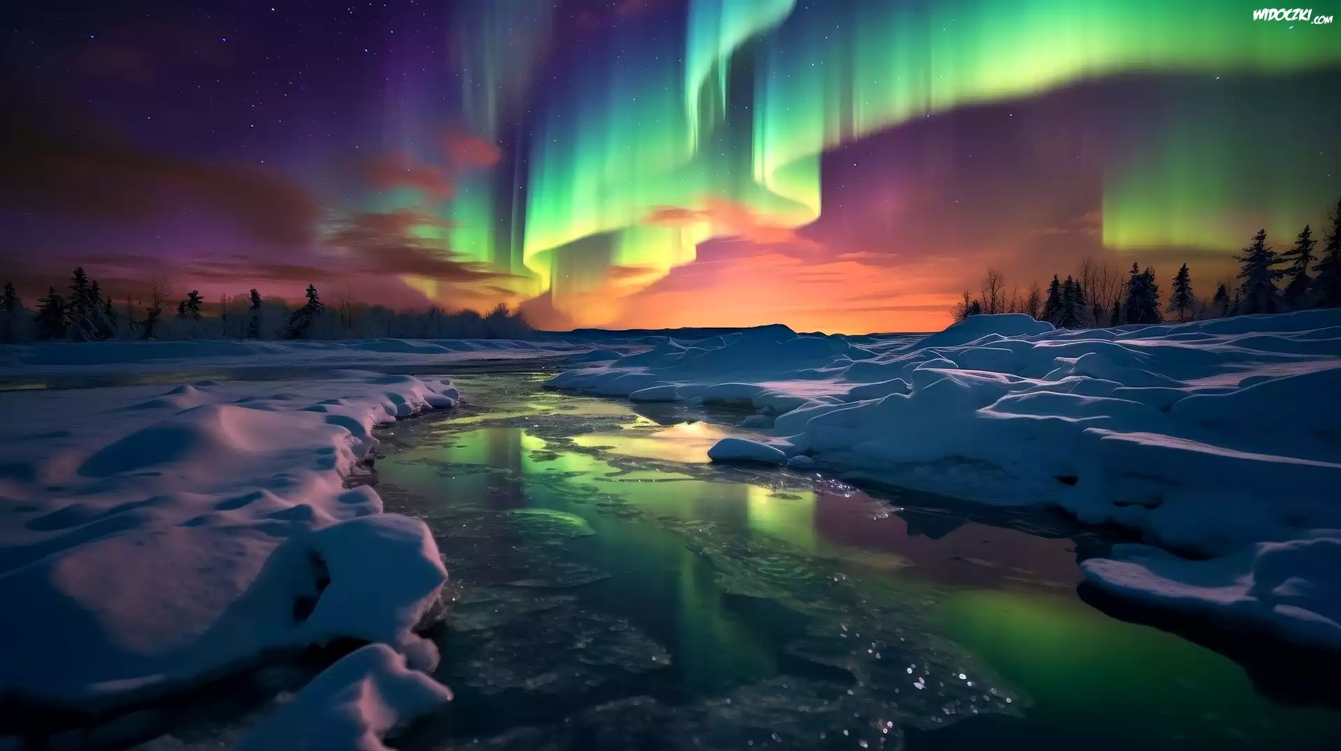 Zima, Rzeka, Zorza polarna, Grafika AI