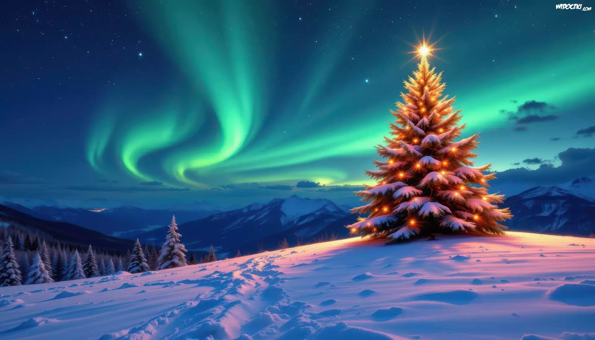 Zdjęcia, Góry, Zima, Boże Narodzenie, Choinka, Drzewa, Zorza polarna