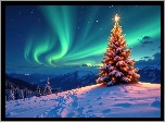 Góry, Zima, Boże Narodzenie, Choinka, Drzewa, Zorza polarna