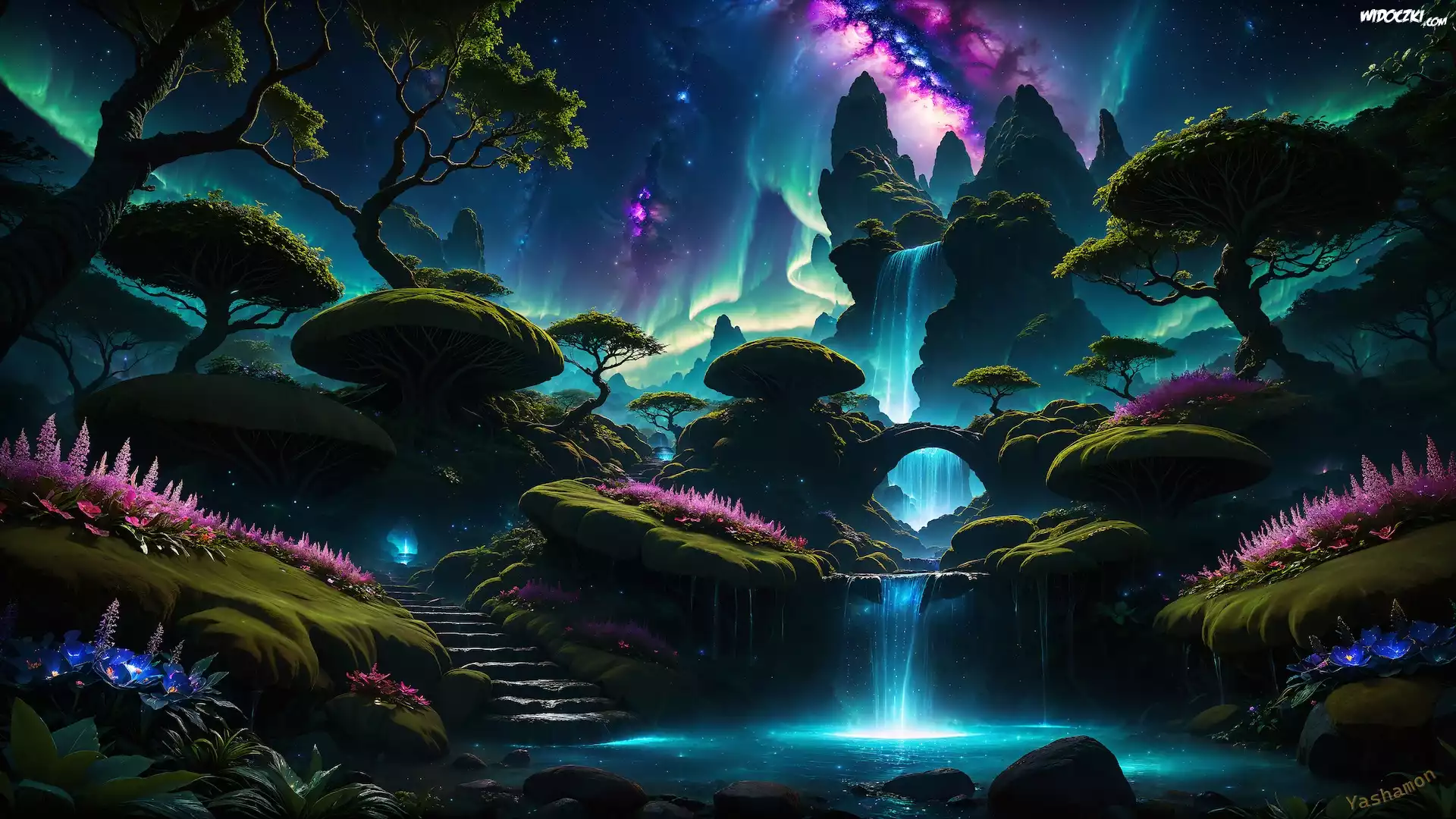 Grafika, Drzewa, Schody, Wodospad, Droga Mleczna, Zorza polarna
