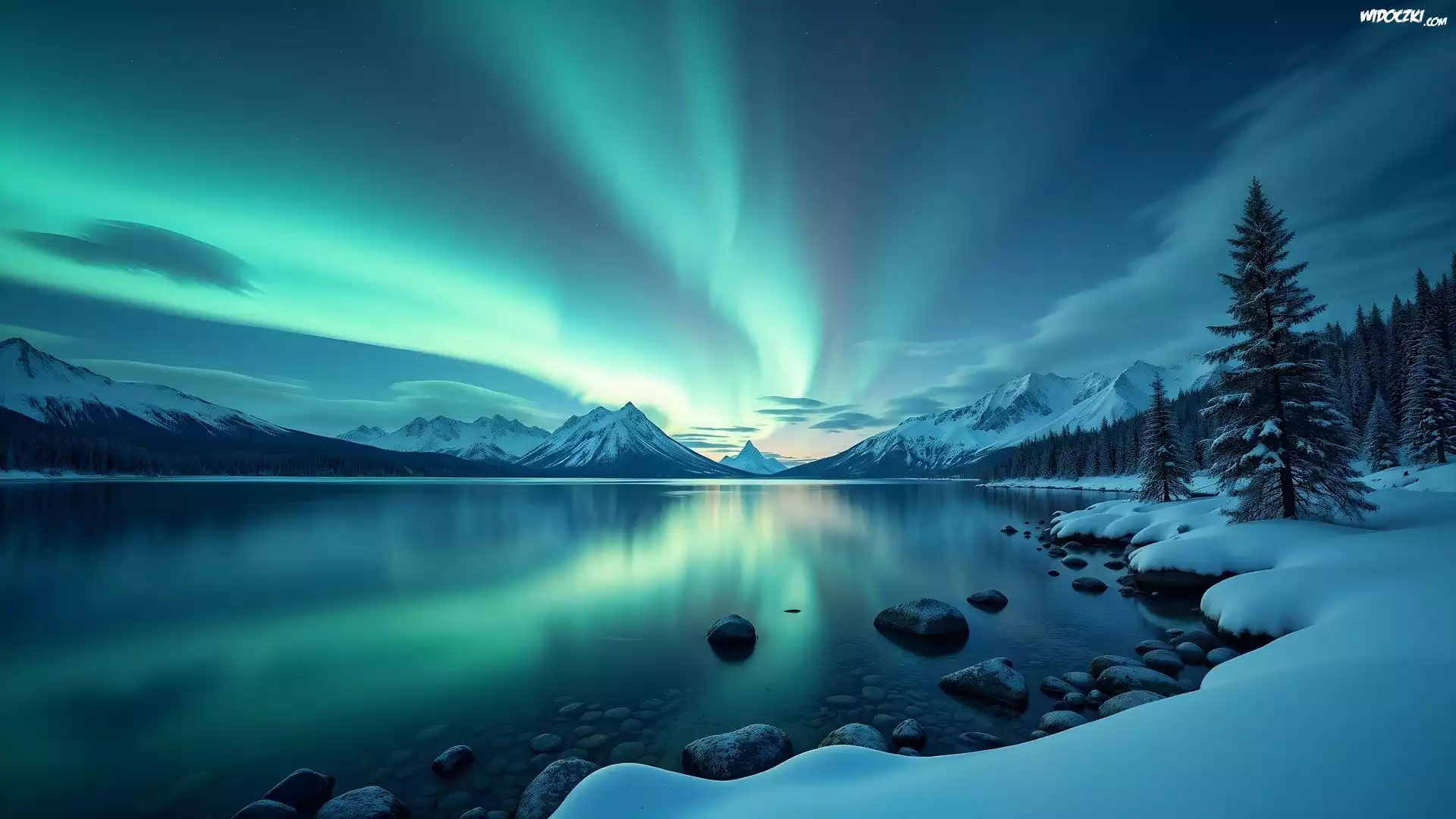 Zorza Polarna, Niebo, Gwiazdy, Jezioro, Noc Góra, Chmury, Niebo Zima Góra, Zachody Śłońca Kagaya, Góra, Lodowa, Zorza, Polarna, Narwale Góra Piwo, Calsberg, Góry, Śnieg Zorza, Polarna, Drzewa, Zima Jezioro, Góry Góra, Skały Góra Zima, Drzewa, Przebijające, Światło Góra, Jeziora Góry, Gwiazdy, Zorza, Polarna