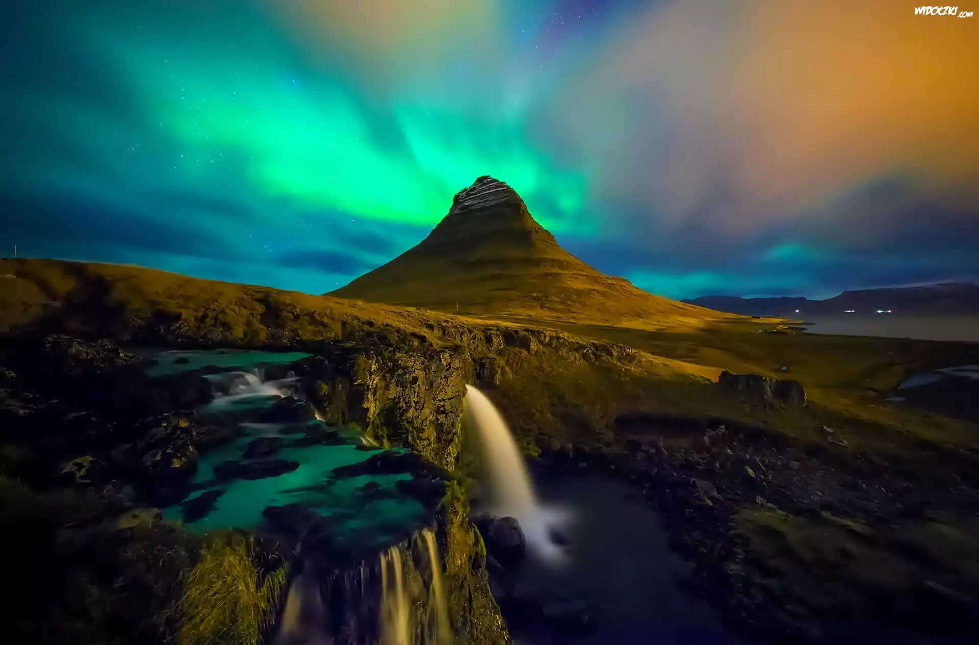 Zdjęcia, Islandia, Góra Kirkjufell, Wodospad Kirkjufellsfoss, Rzeka, Kamienie, Zorza polarna