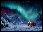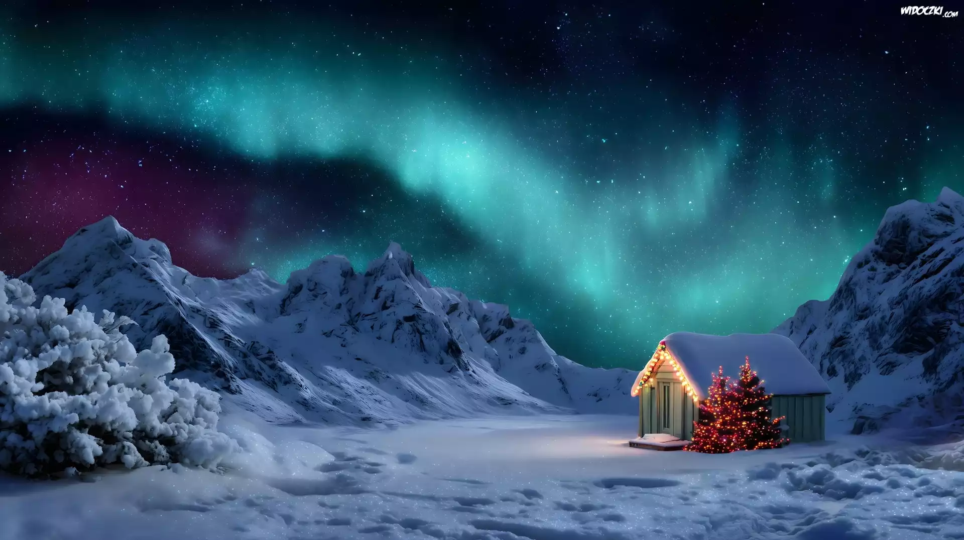 Zdjęcia, Góry, Zima, Zorza polarna, Domek, Drewniany, Choinki