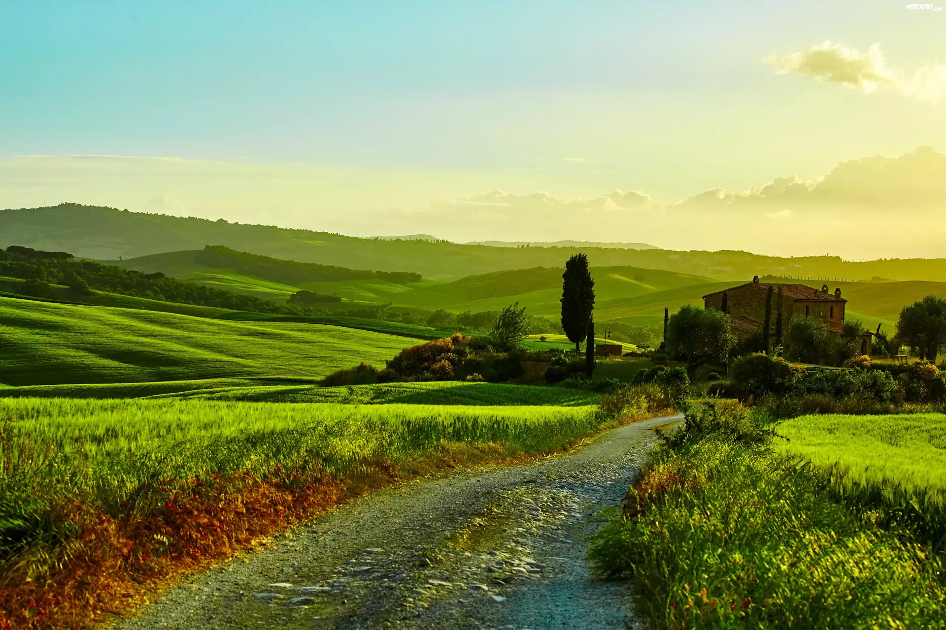 Pole, Łąka, Droga, Wzgórza