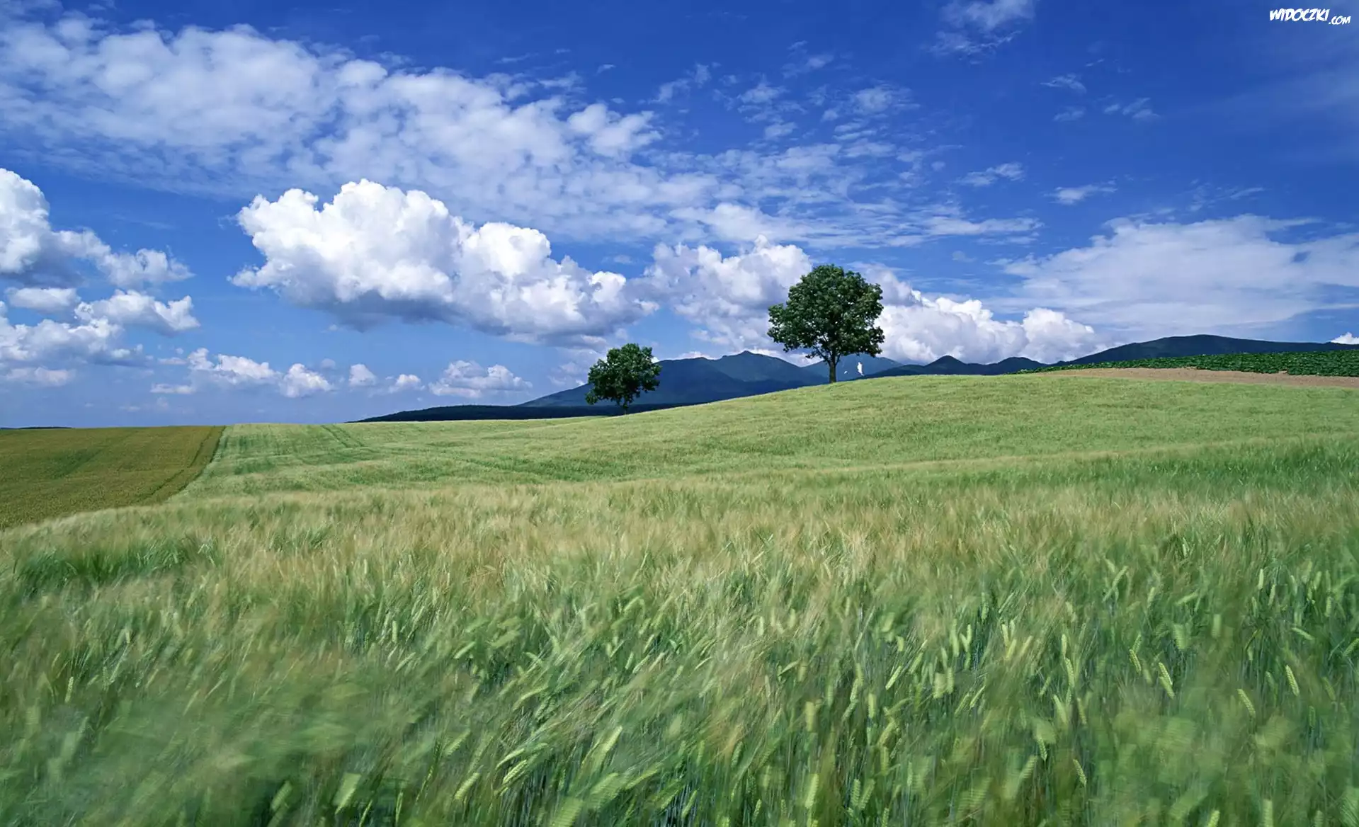 Zdjęcia, Pole, Góry, Drzewa, Chmury