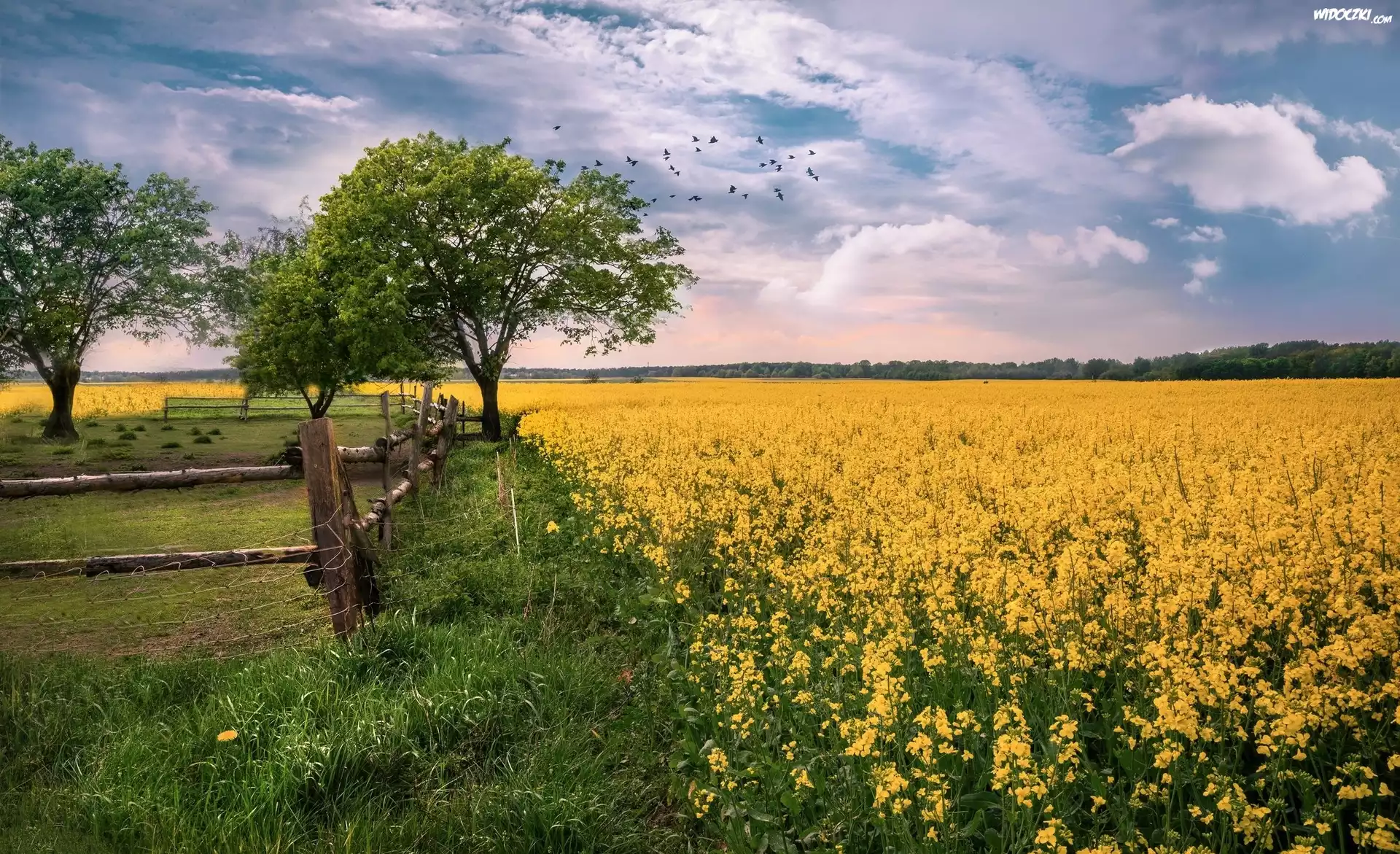 Pole, Rzepak, Drzewa, Ogrodzenie