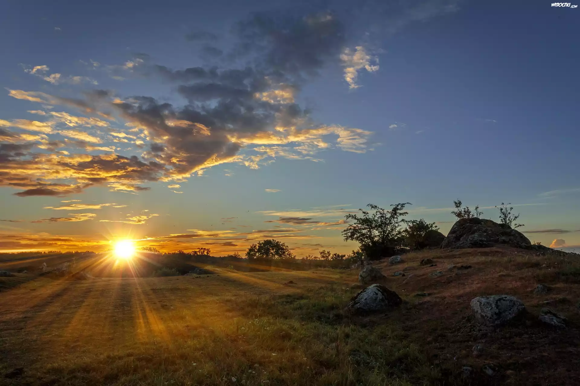 Zdjęcia, Pole, Zachód słońca, Chmury, Drzewa, Kamienie
