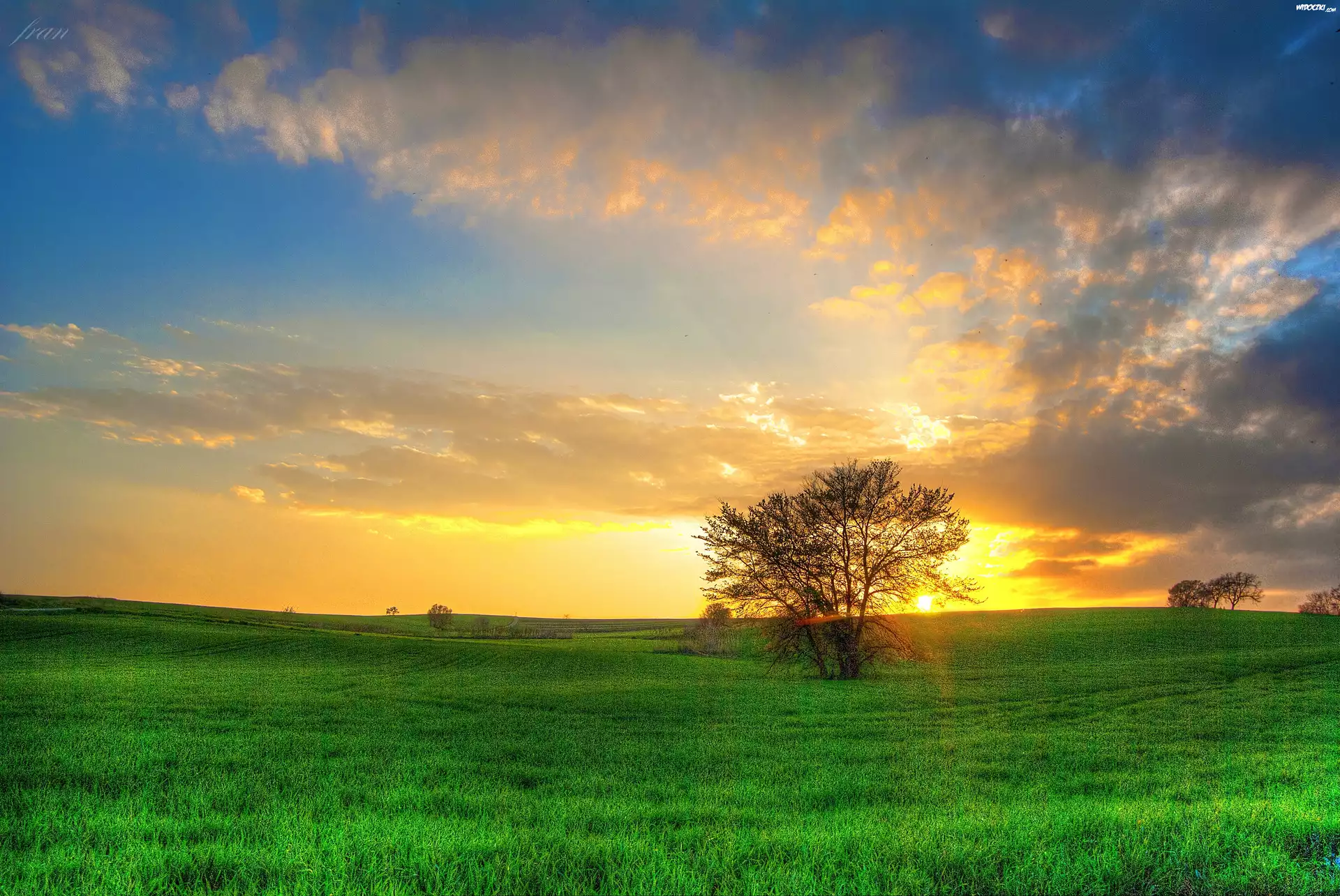 Zdjęcia, Pole, Zachód słońca, Drzewa, Chmury