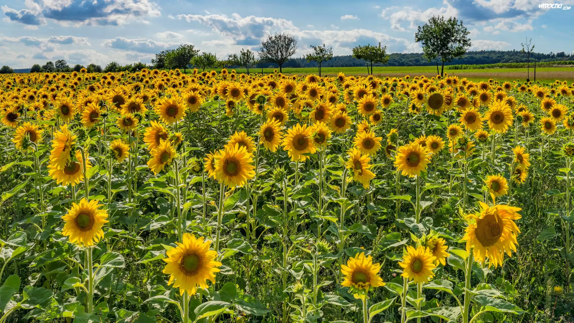 Zdjęcia, Pole, Słoneczniki, Drzewa